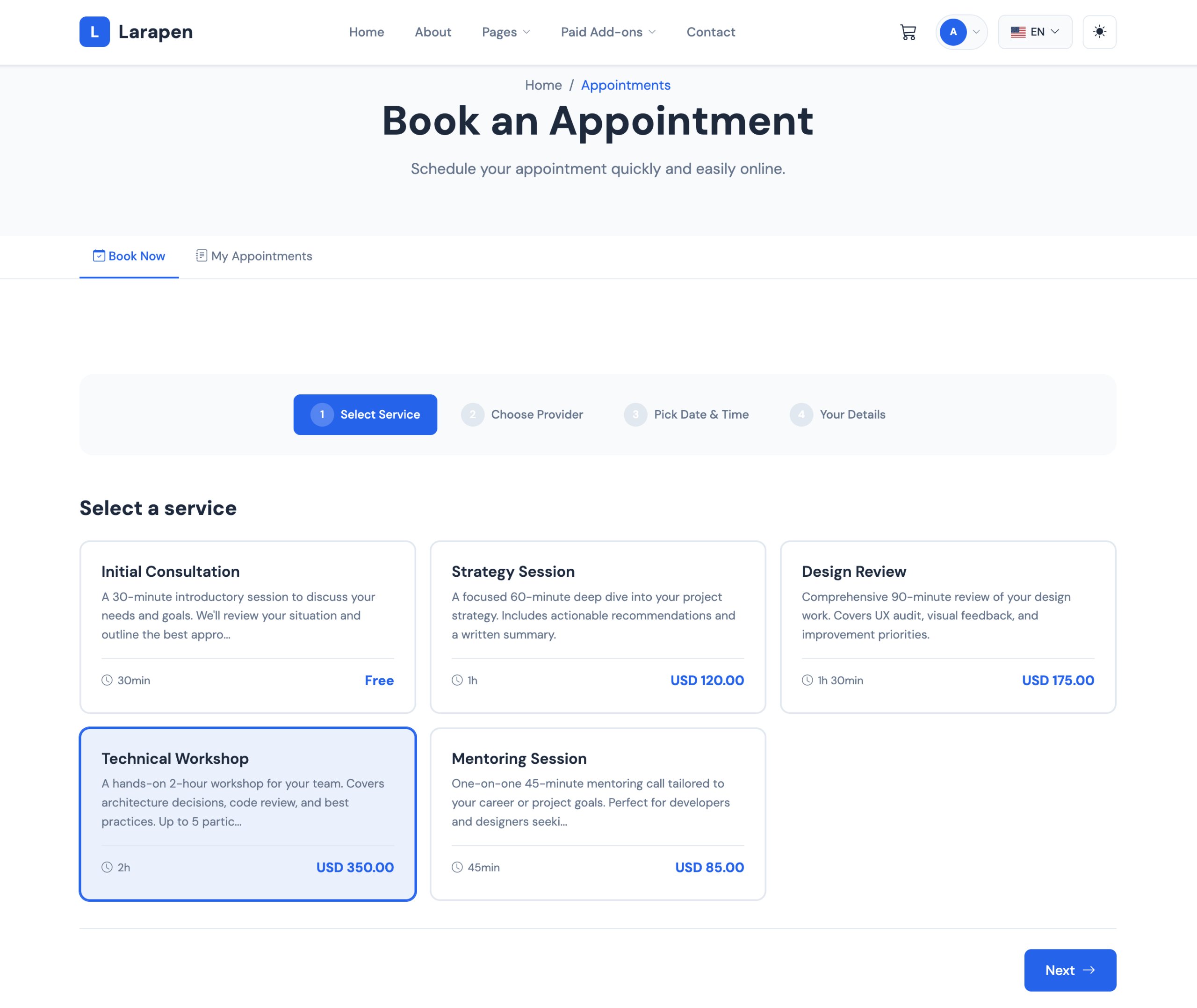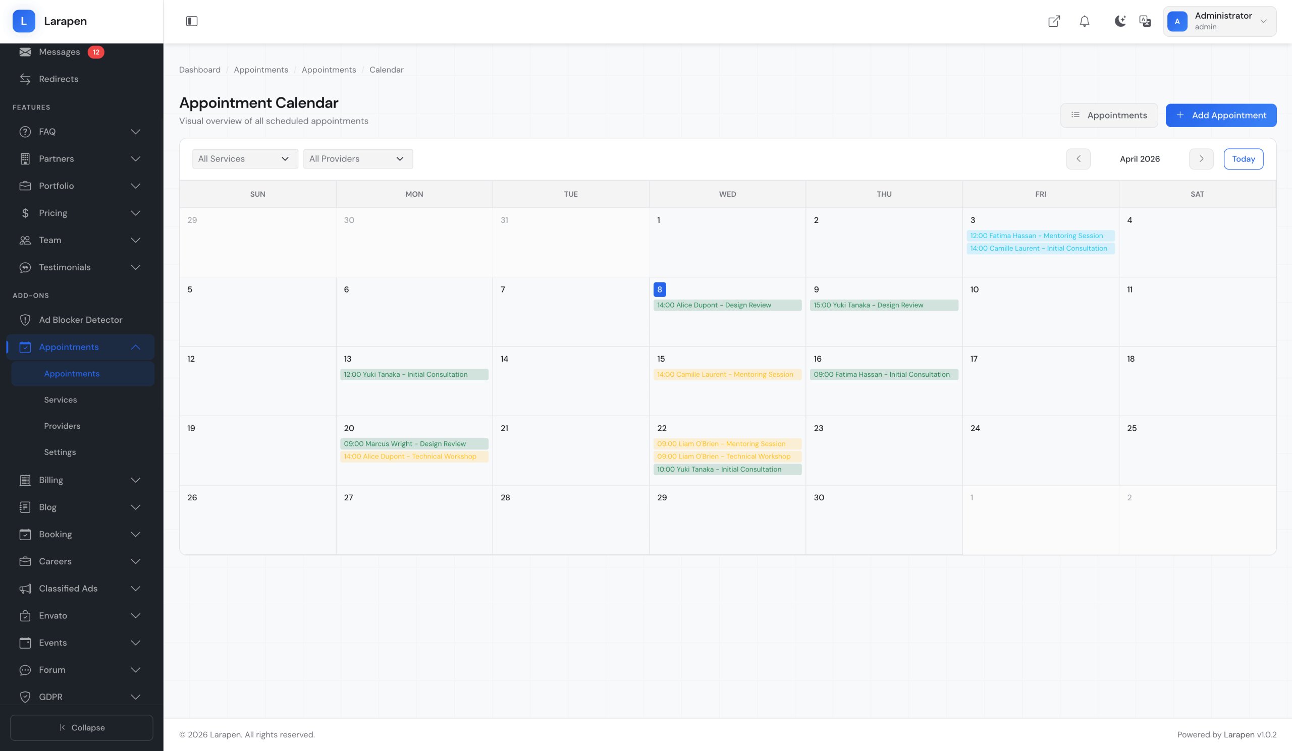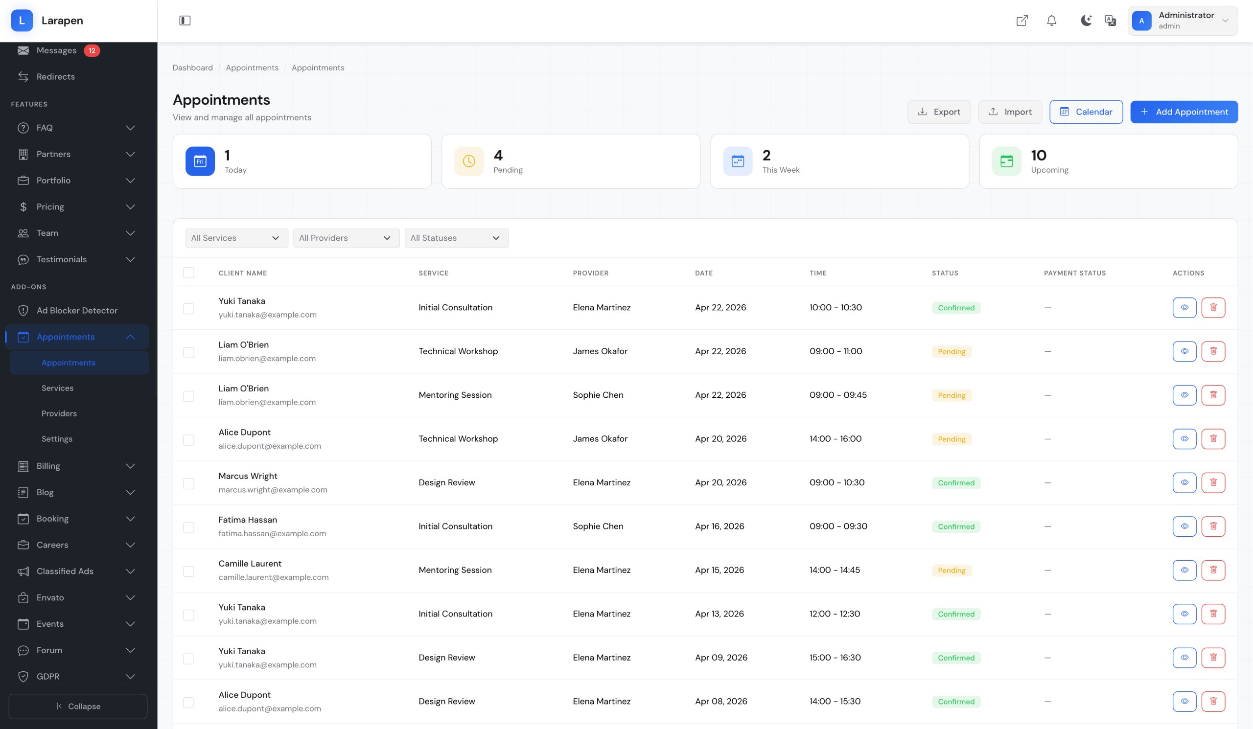 Let clients book appointments and services directly on your website. Manage availability, time slots, confirmations, and reminders. All from your Larapen admin panel.