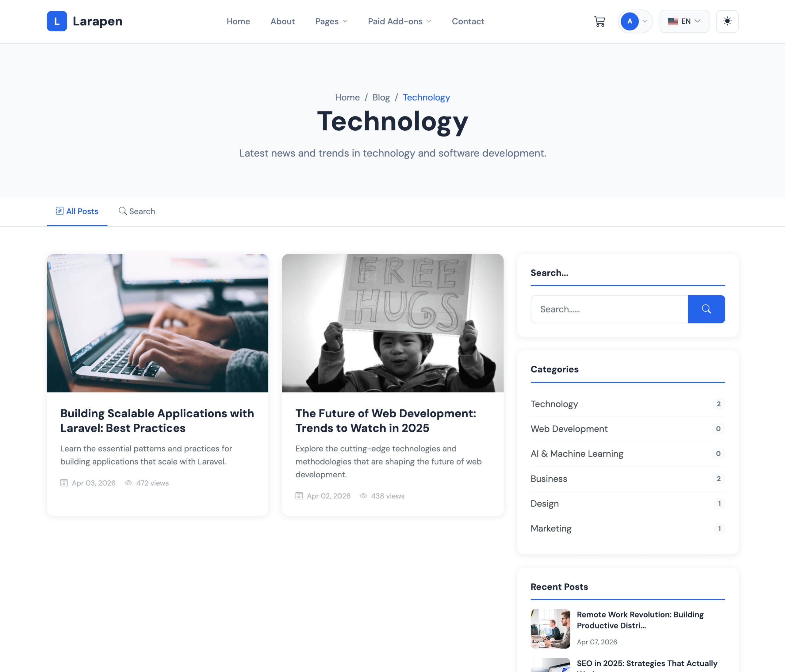 The Blog add-on gives you a complete editorial platform built right into your Larapen site. Write rich articles with an intuitive WYSIWYG editor, organize content with categories and tags, and let your readers engage through a built-in commenting system. Every post is fully optimized for search engines with customizable meta titles, descriptions, and clean URLs.