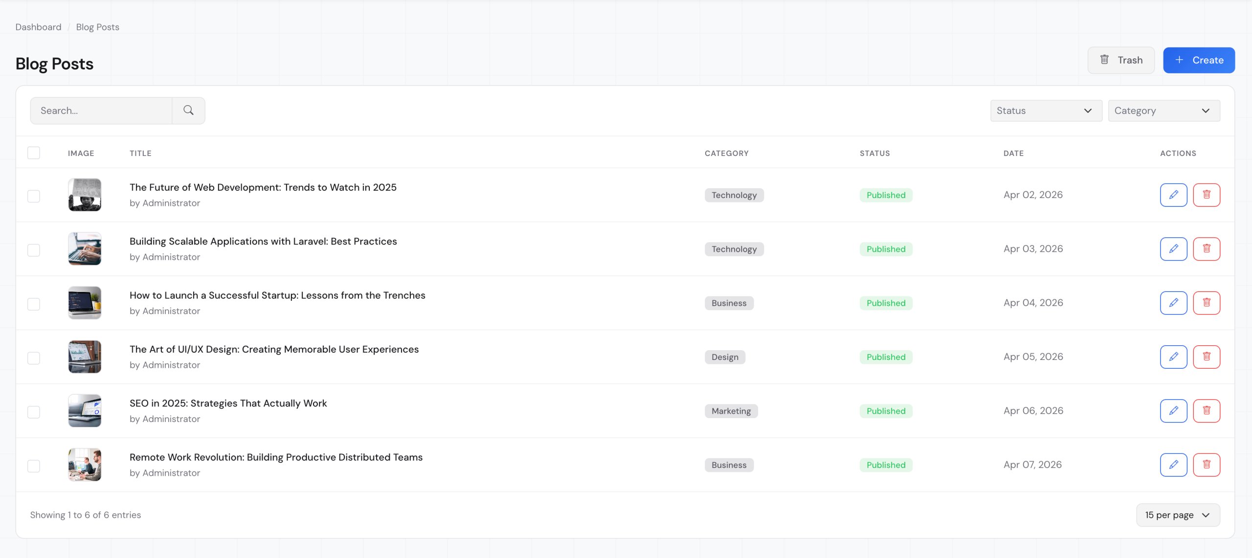 Create your first post with the rich editor, set a featured image, choose a category, and hit publish. Your blog is live.