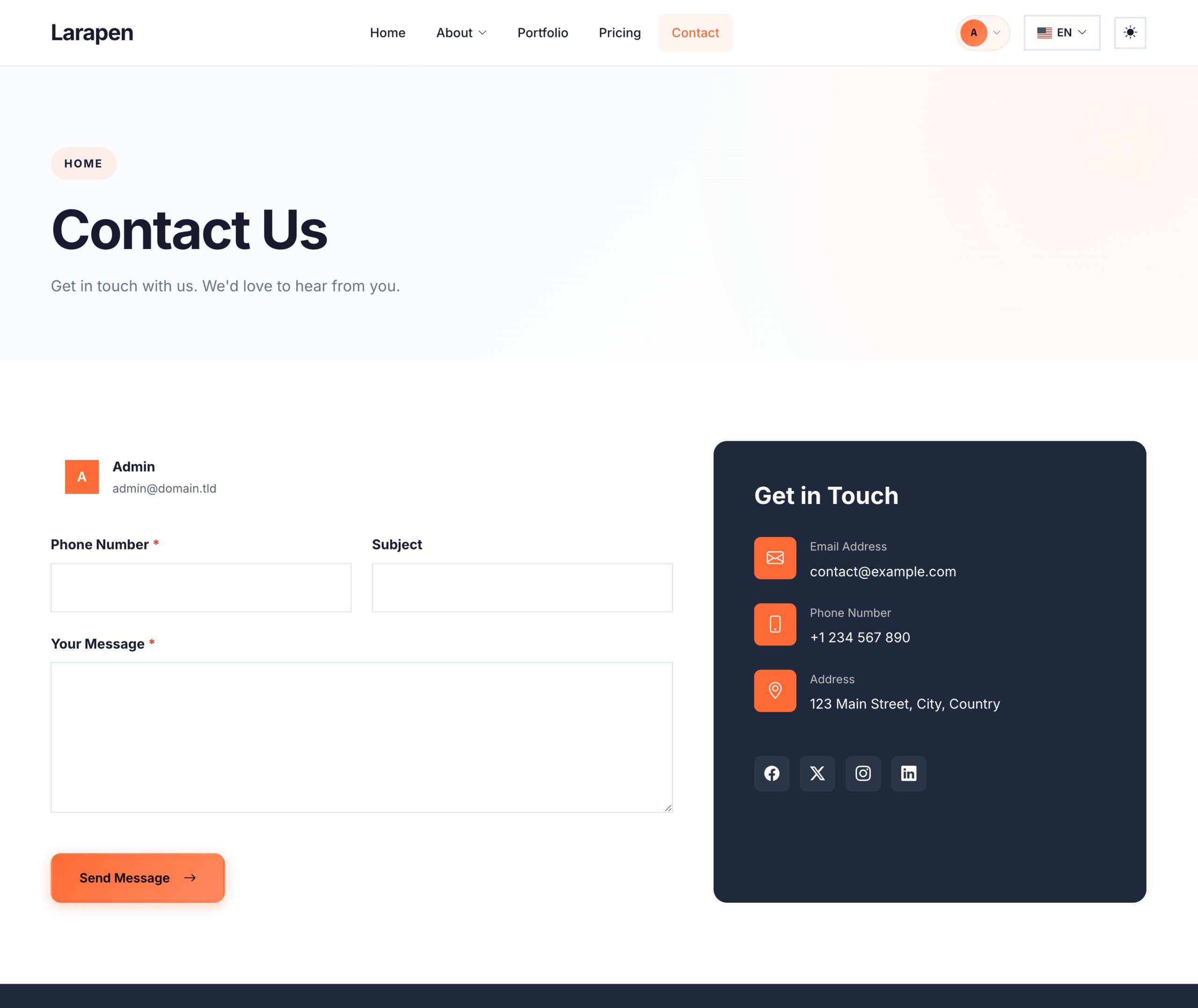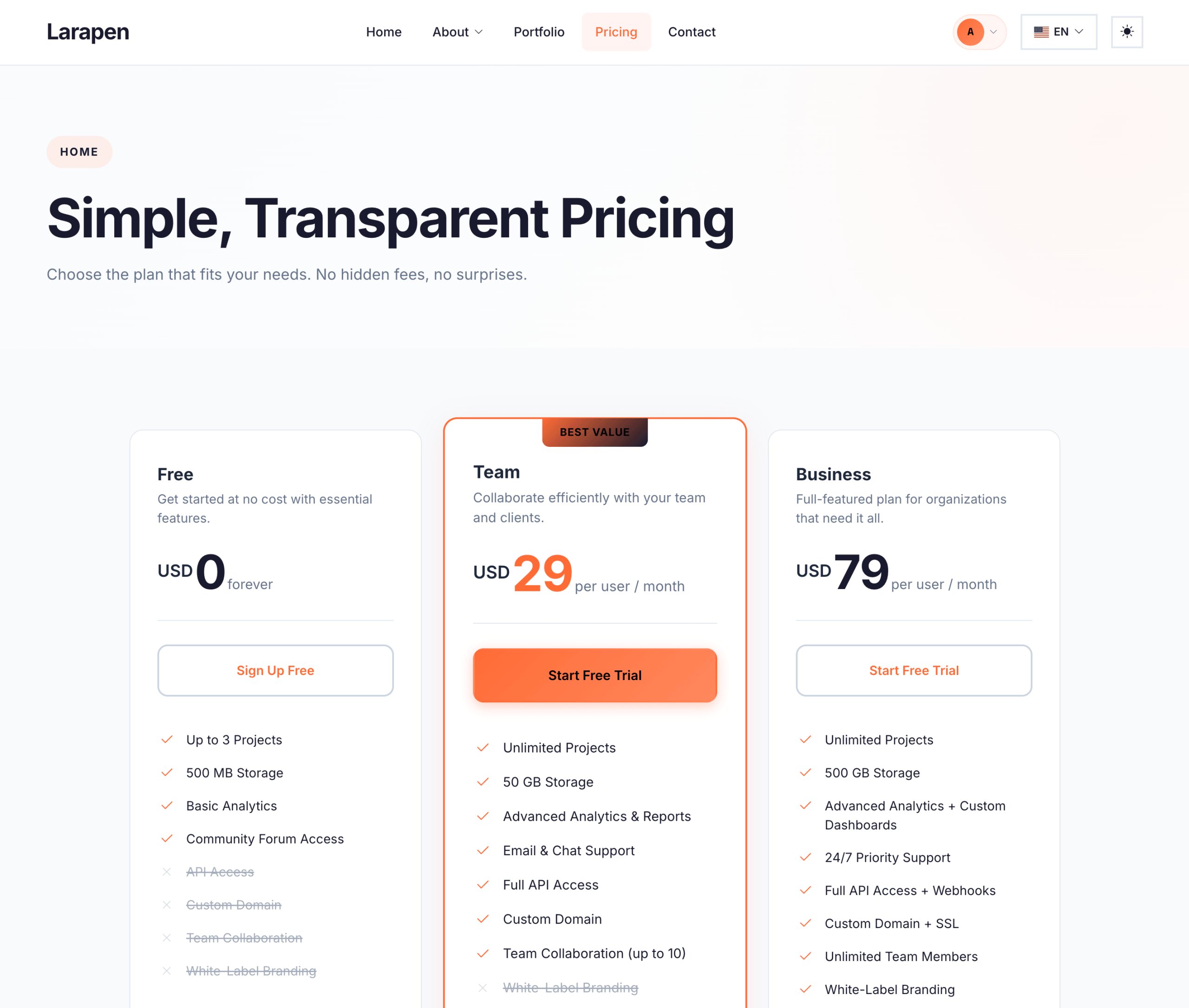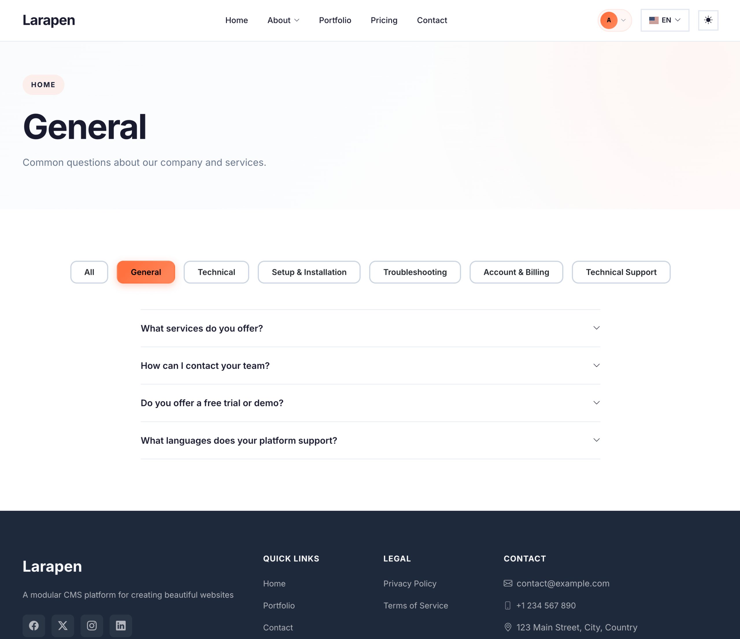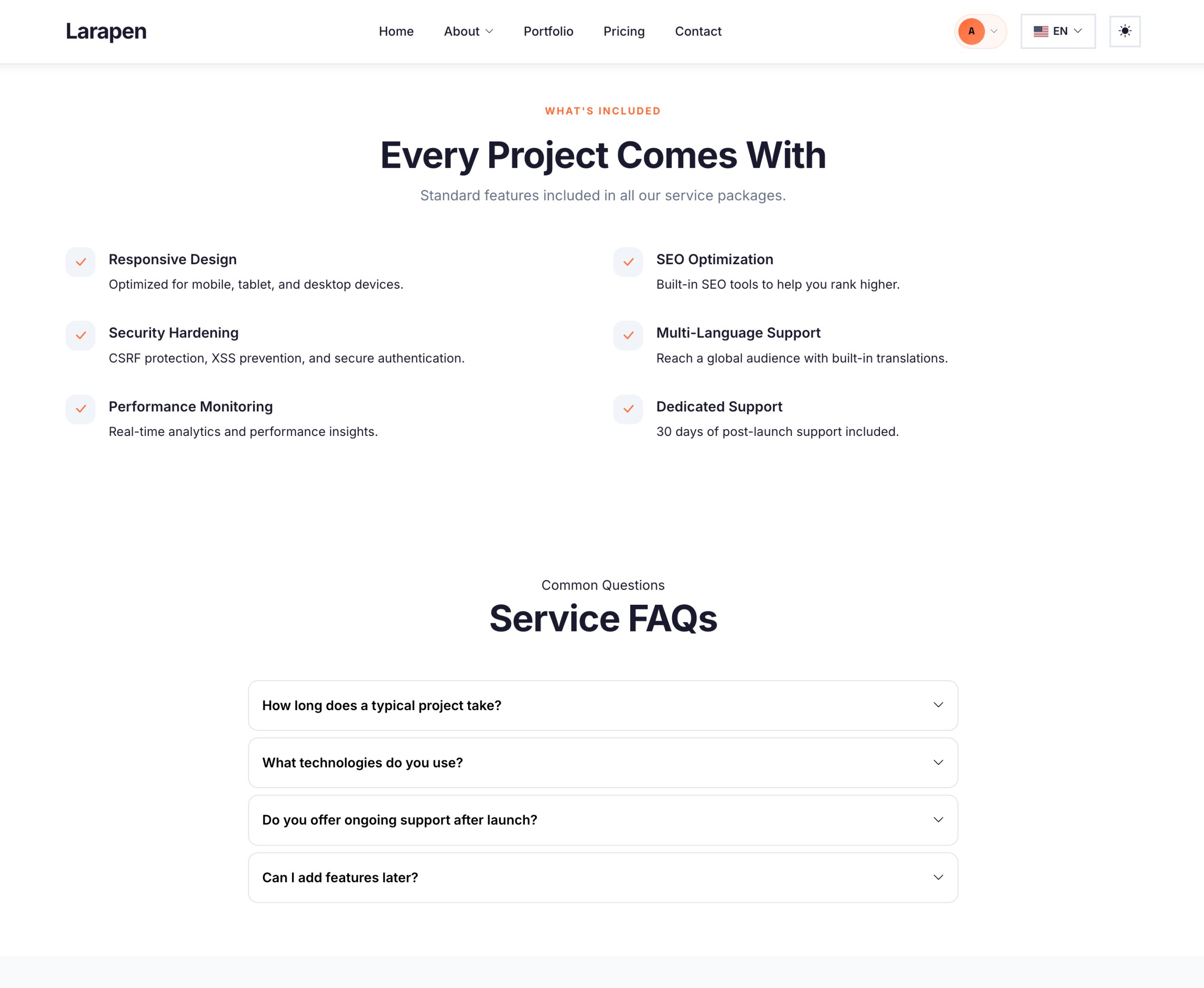 Styled views for all Larapen add-ons including Blog, Shop, FAQ, Pricing, and more. Every add-on looks native to the Creative design language.