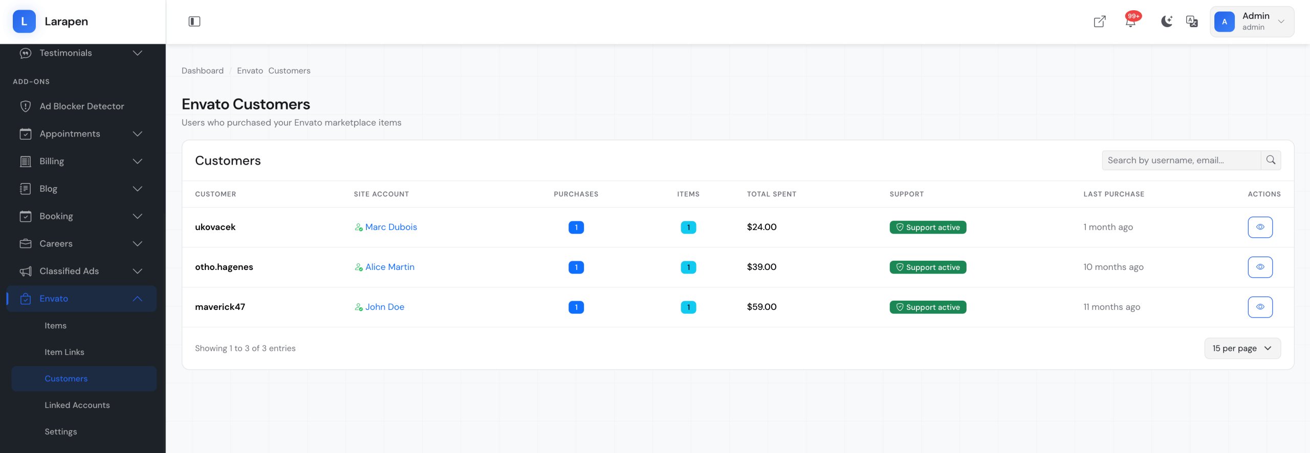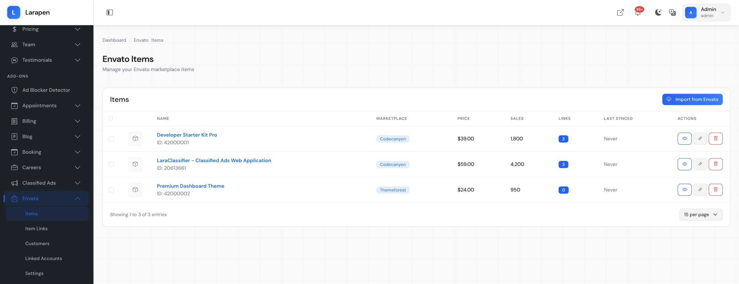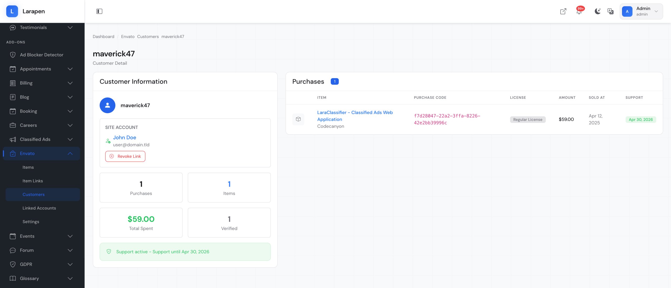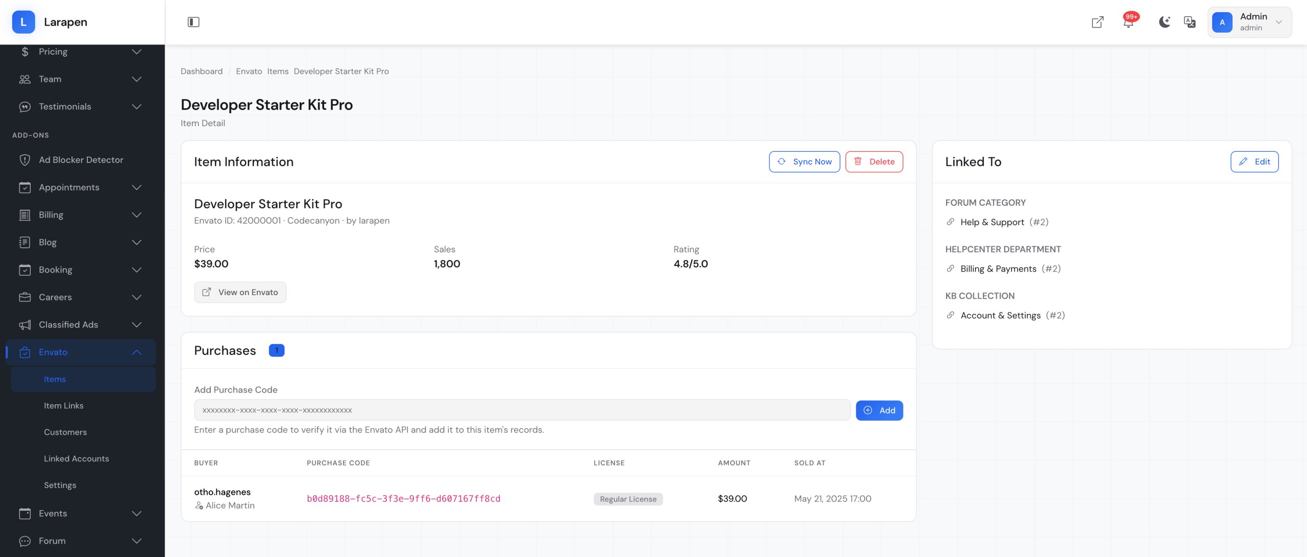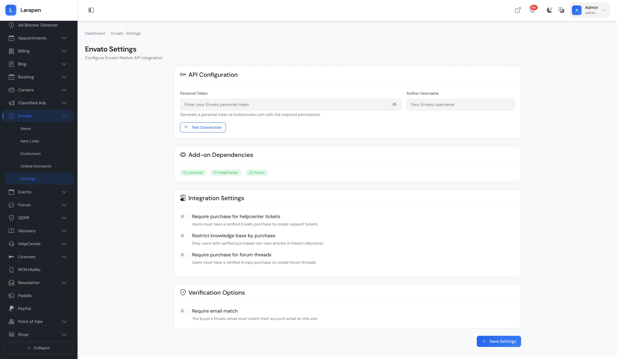 Connect your Larapen platform to Envato Market. Verify purchases automatically, manage licenses, validate support eligibility, and sync customer data from CodeCanyon.