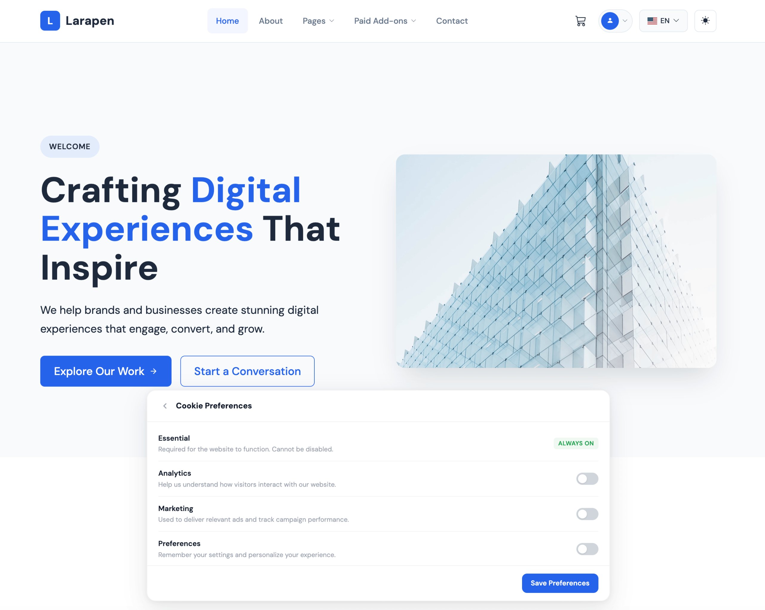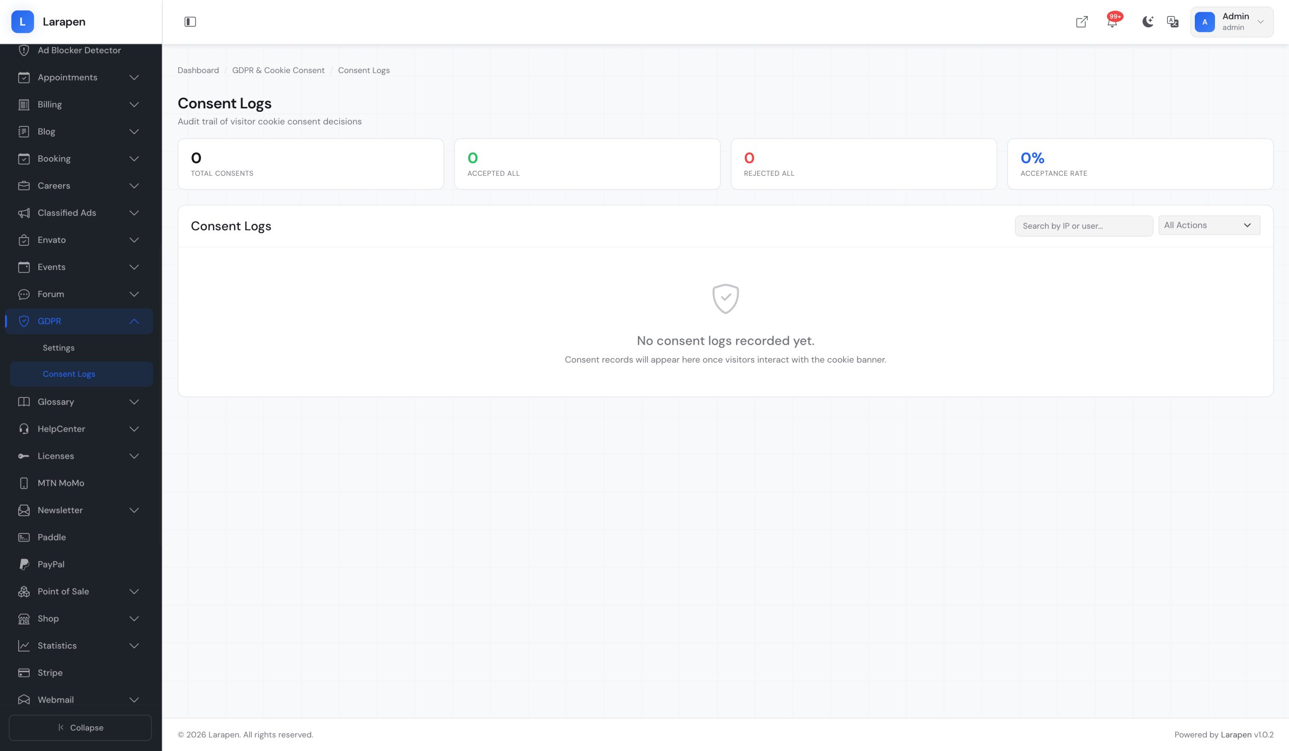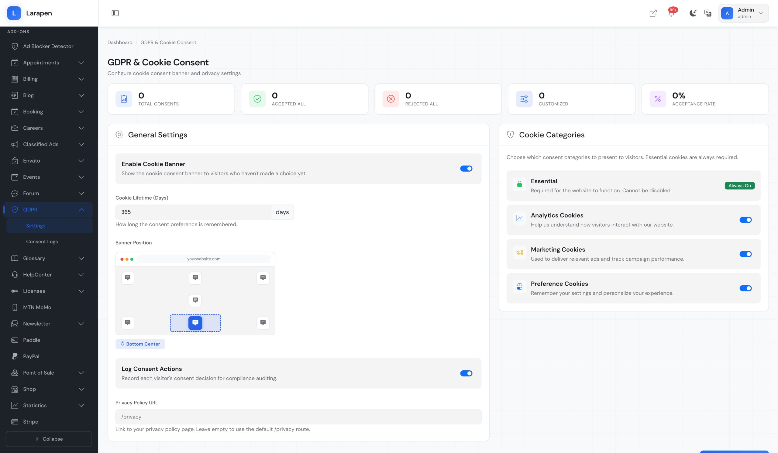 GDPR, ePrivacy Directive, CCPA, LGPD: privacy regulations are multiplying around the world, and the penalties for non-compliance are severe. The Larapen GDPR add-on gives you the tools to handle consent management, cookie disclosure, and user data rights without becoming a legal expert. A fully customizable cookie consent banner greets visitors with clear choices, consent decisions are logged with timestamps for audit purposes, and your privacy policy can be managed and versioned directly from the admin panel.