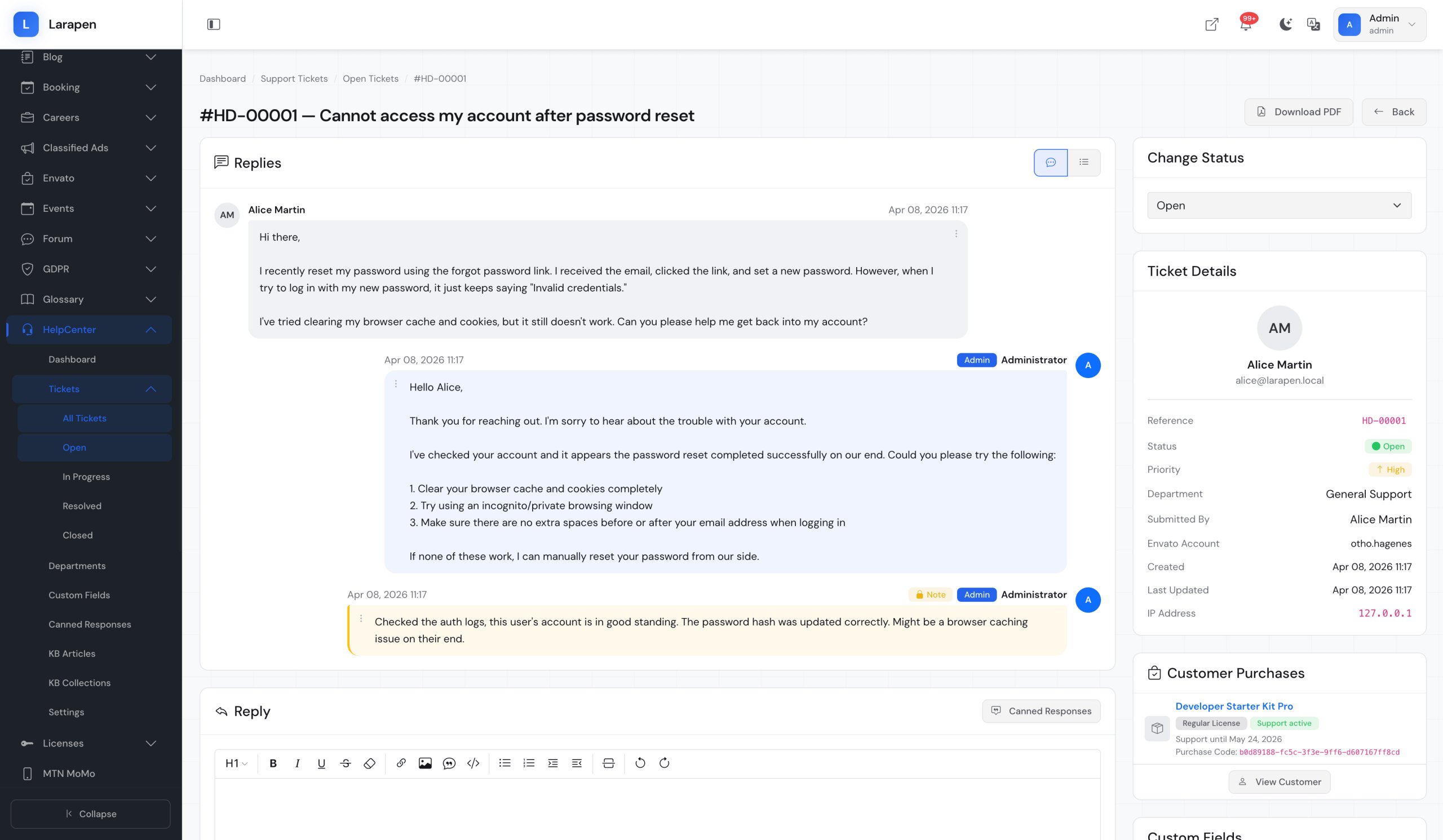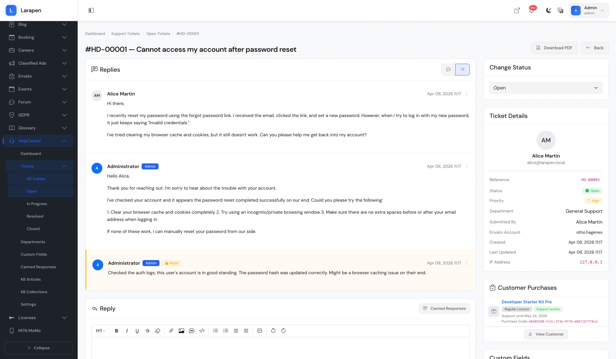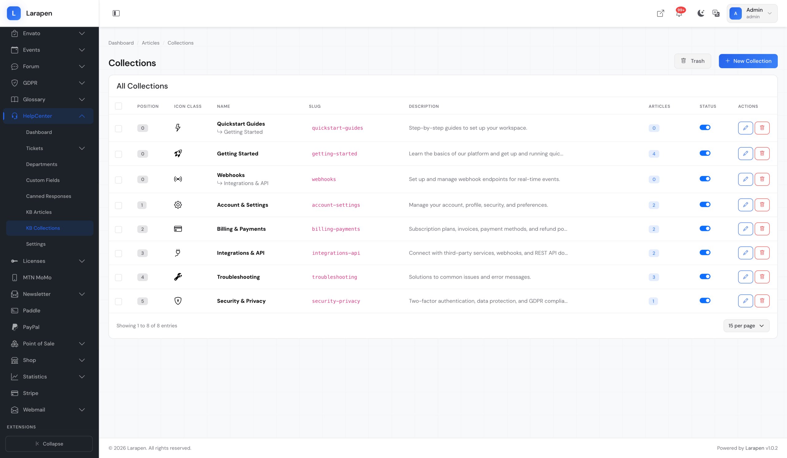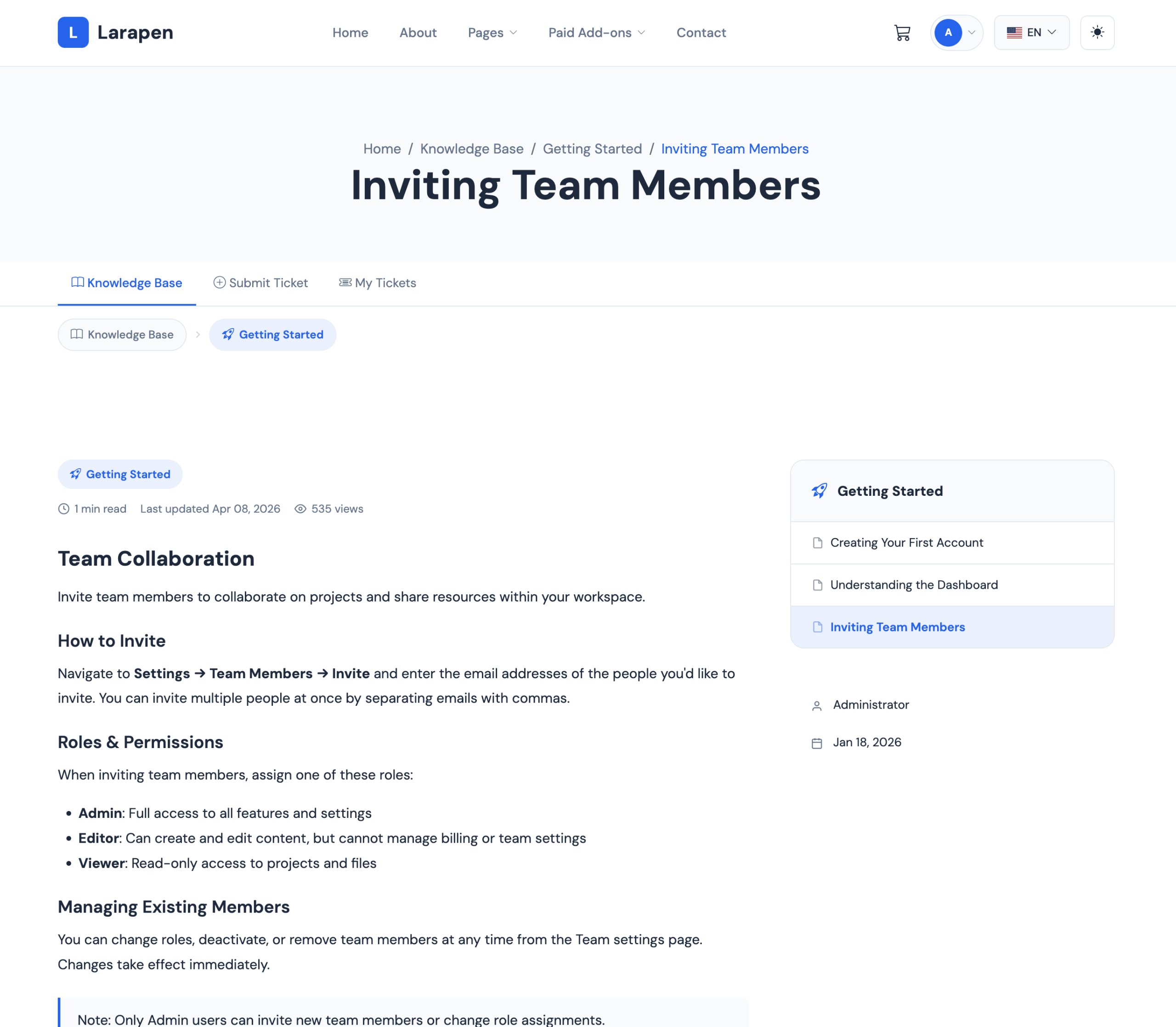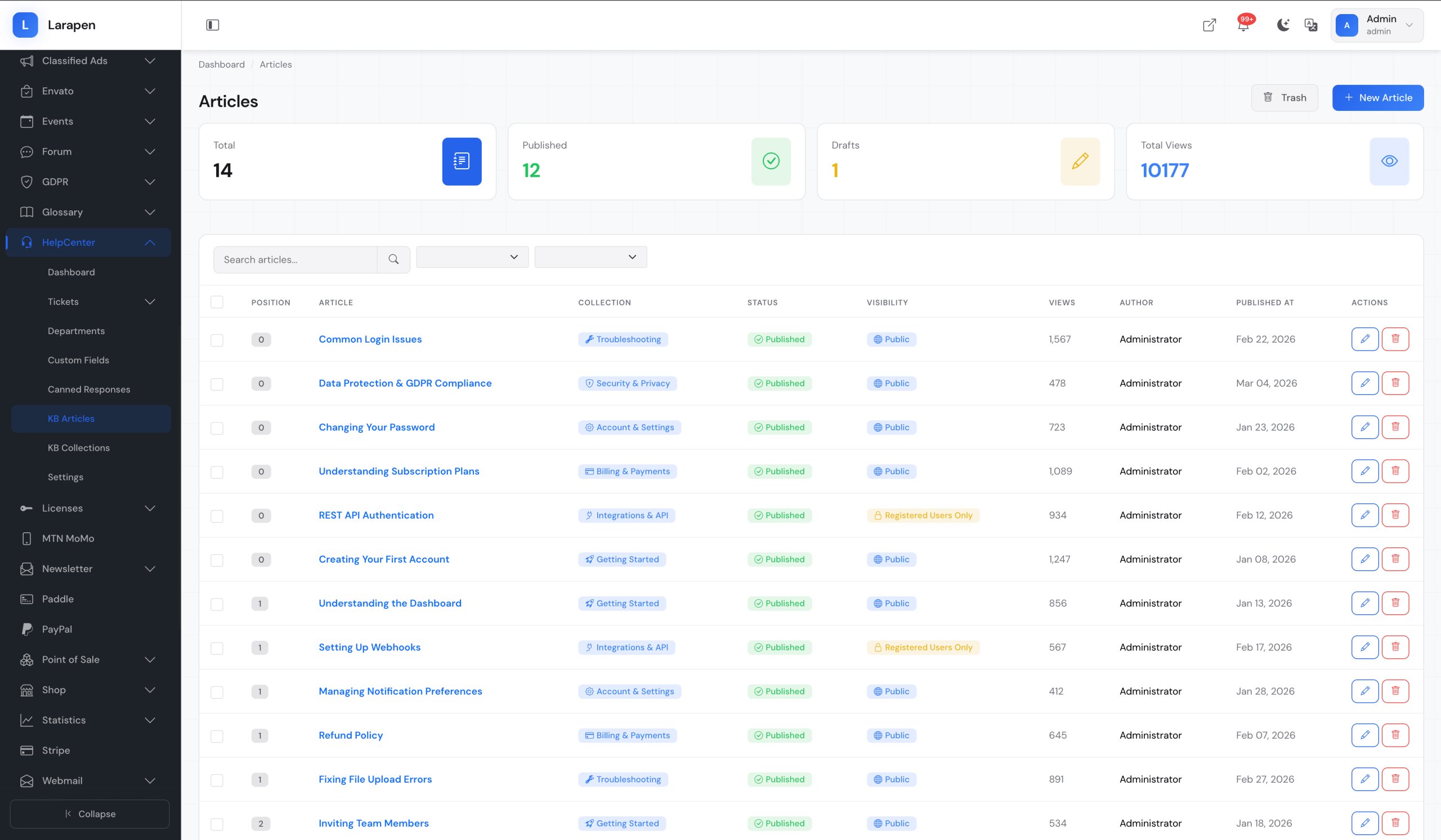 Add knowledge base articles with the rich editor. Assign them to collections and publish when ready.