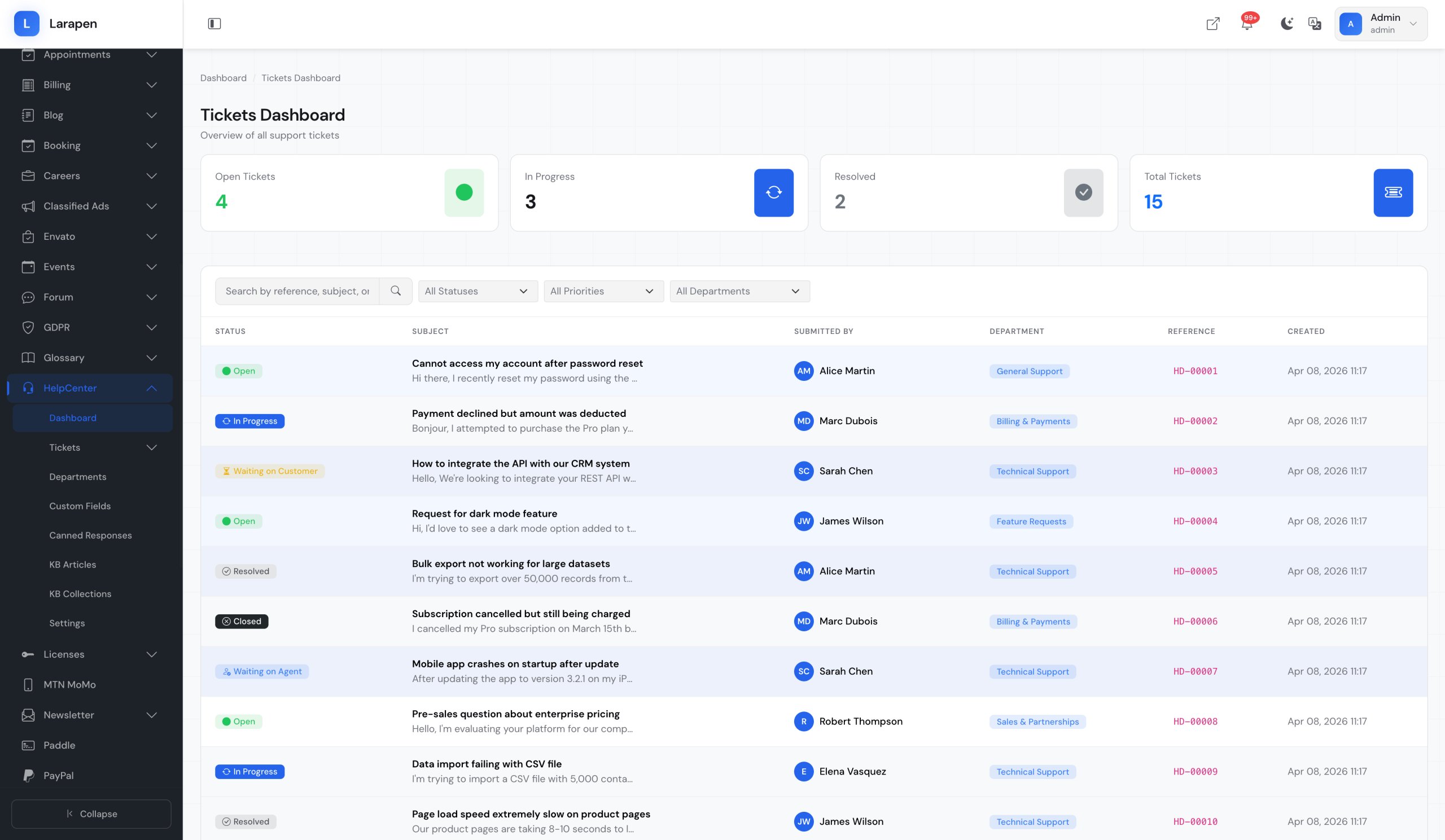 When self-service is not enough, users can submit support tickets directly from the help center, routed to the right department.