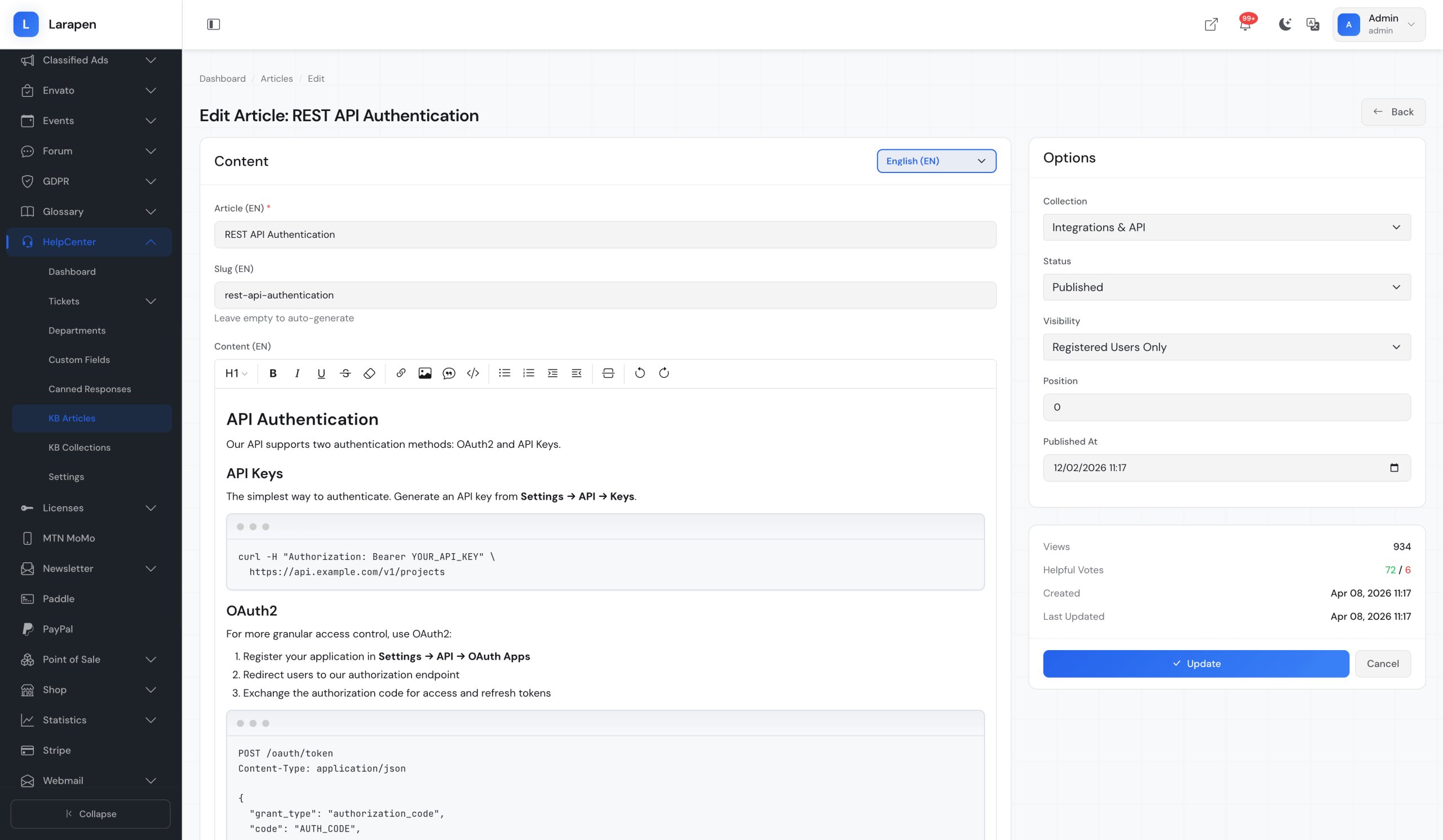 Write detailed help articles with rich formatting, images, and code examples. Each article is SEO-optimized.