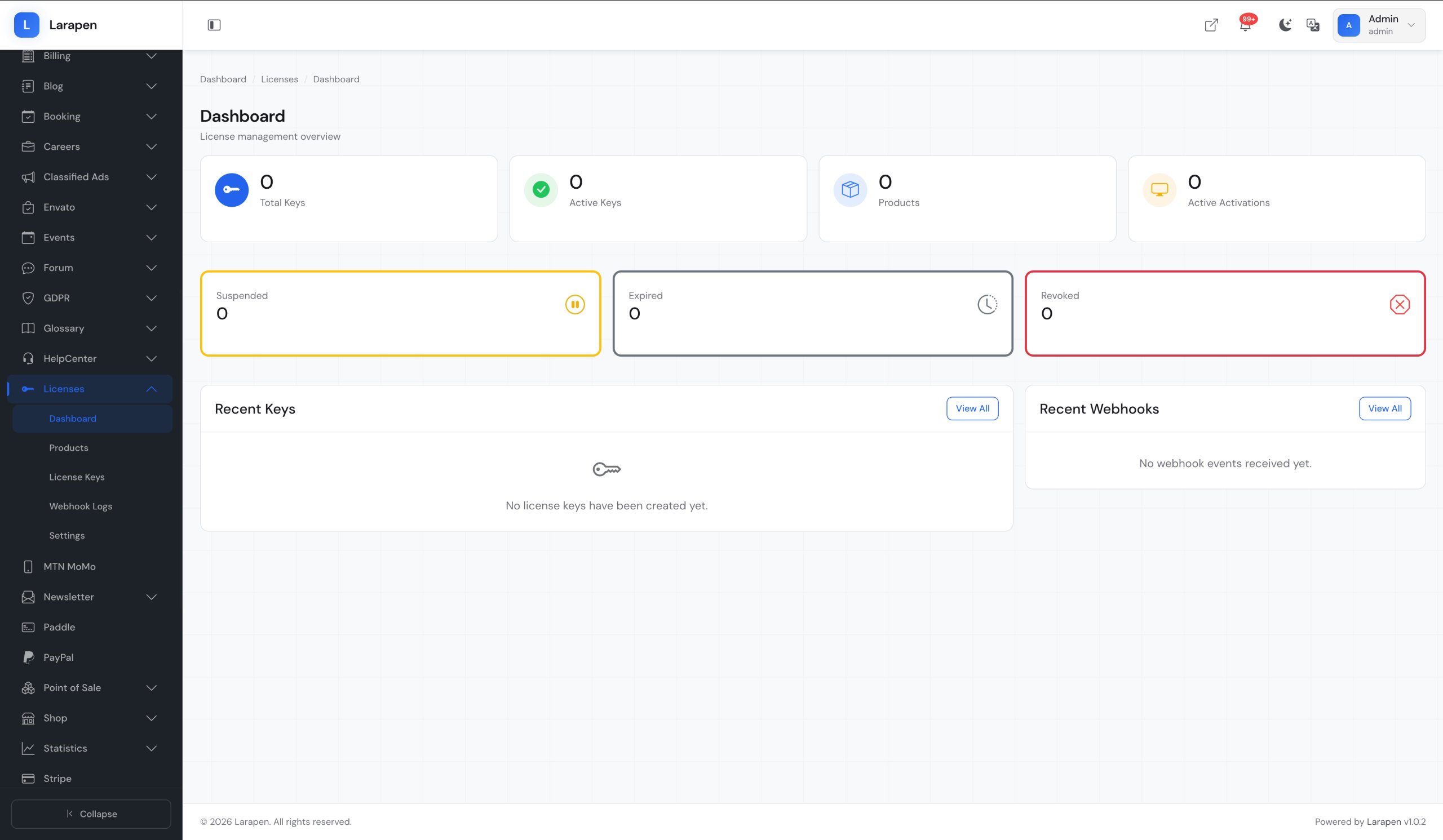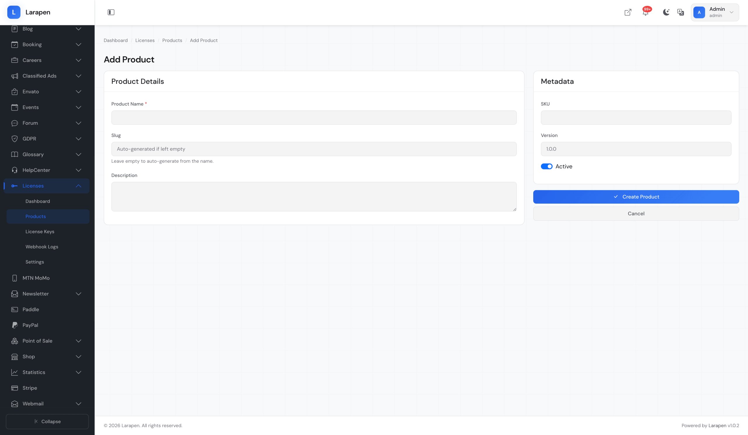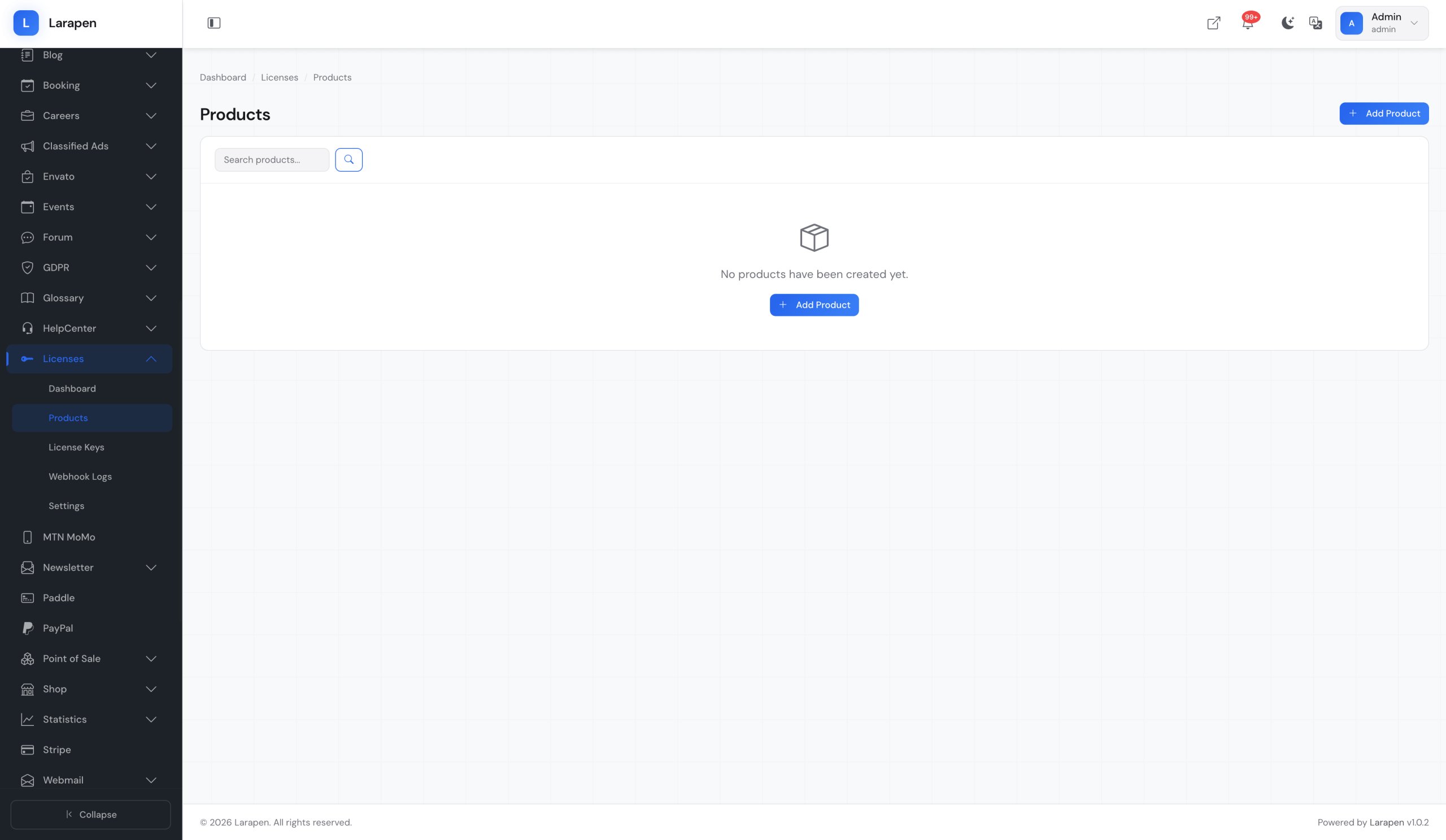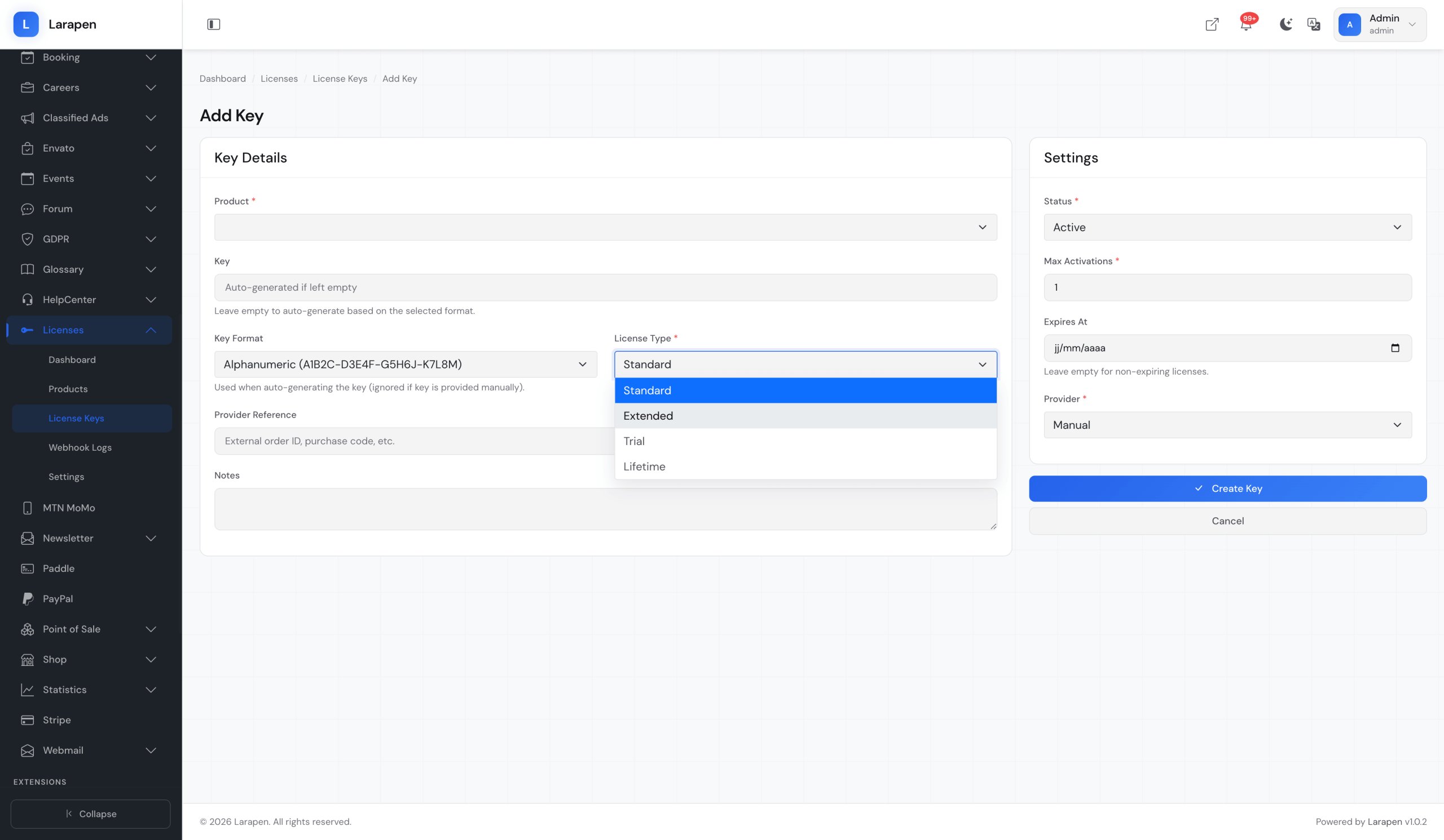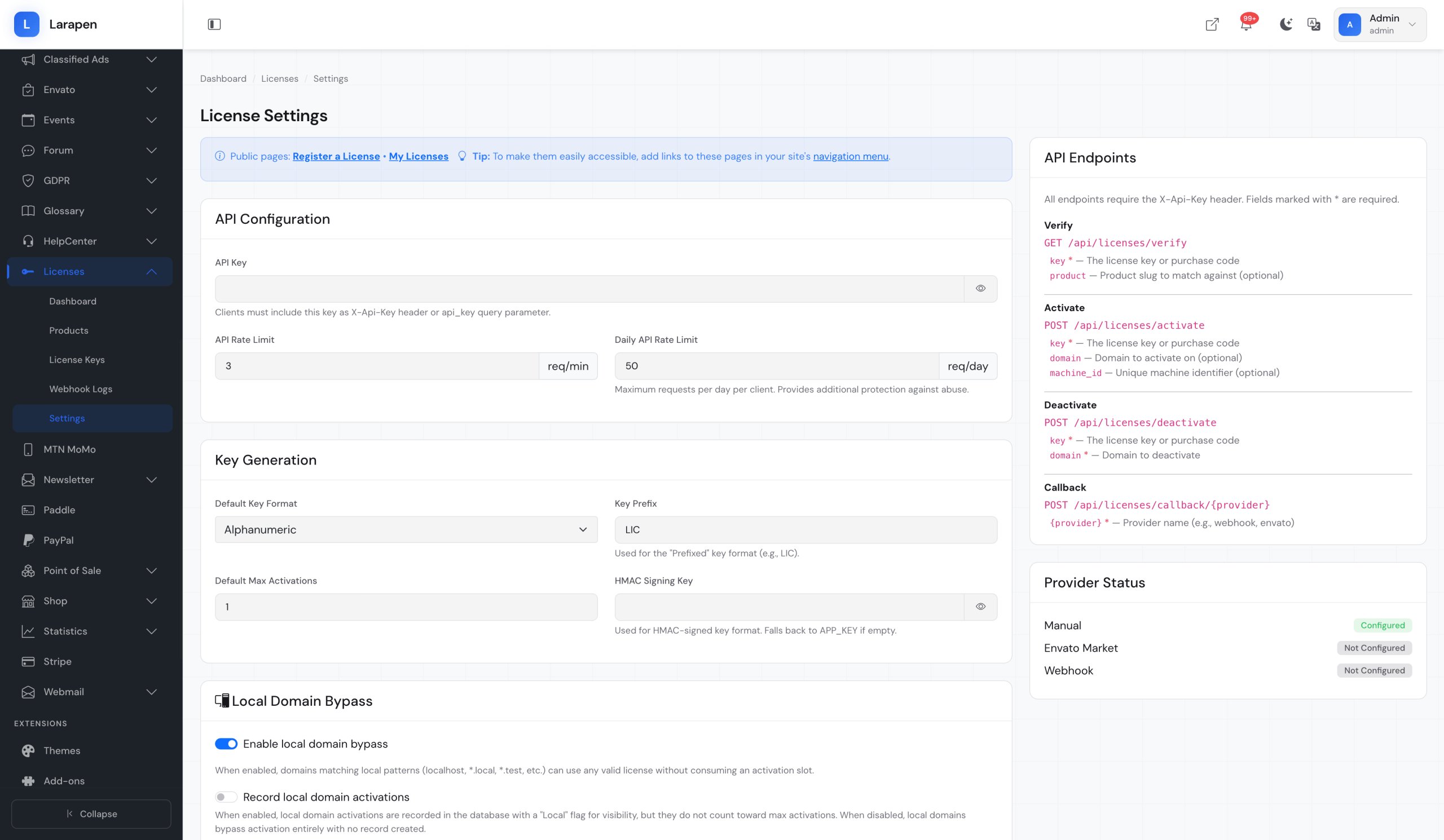 Create your software products and licensing plans in the admin panel. Set the number of allowed activations, validity period, and whether domain binding is required for each plan.