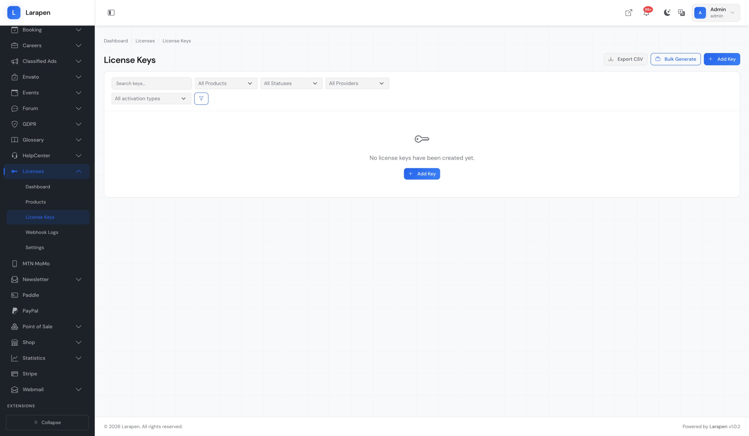 Generate license keys individually or in batches. Keys can be distributed manually, included in purchase confirmation emails, or generated automatically when a customer completes a purchase through the Shop add-on.