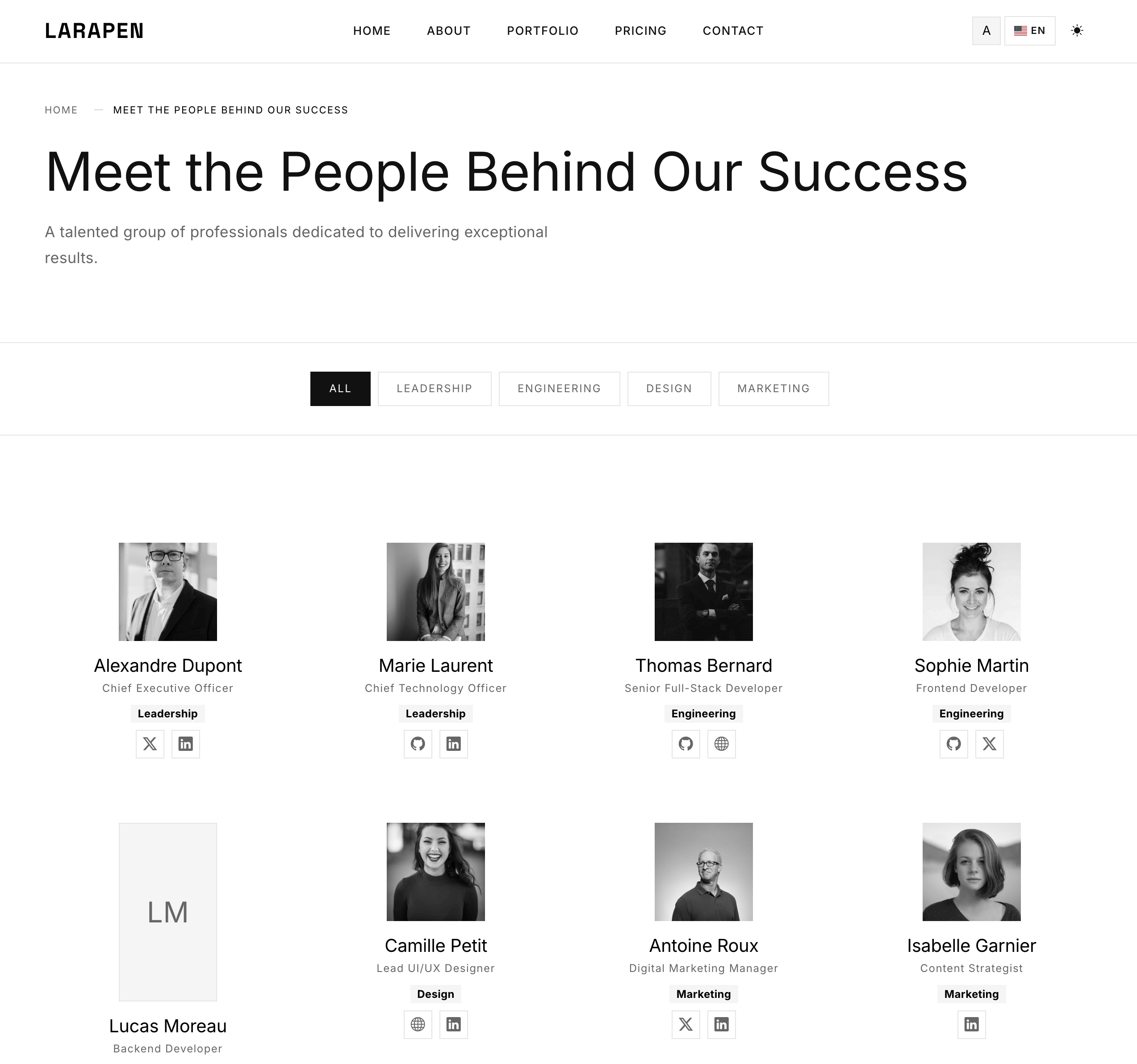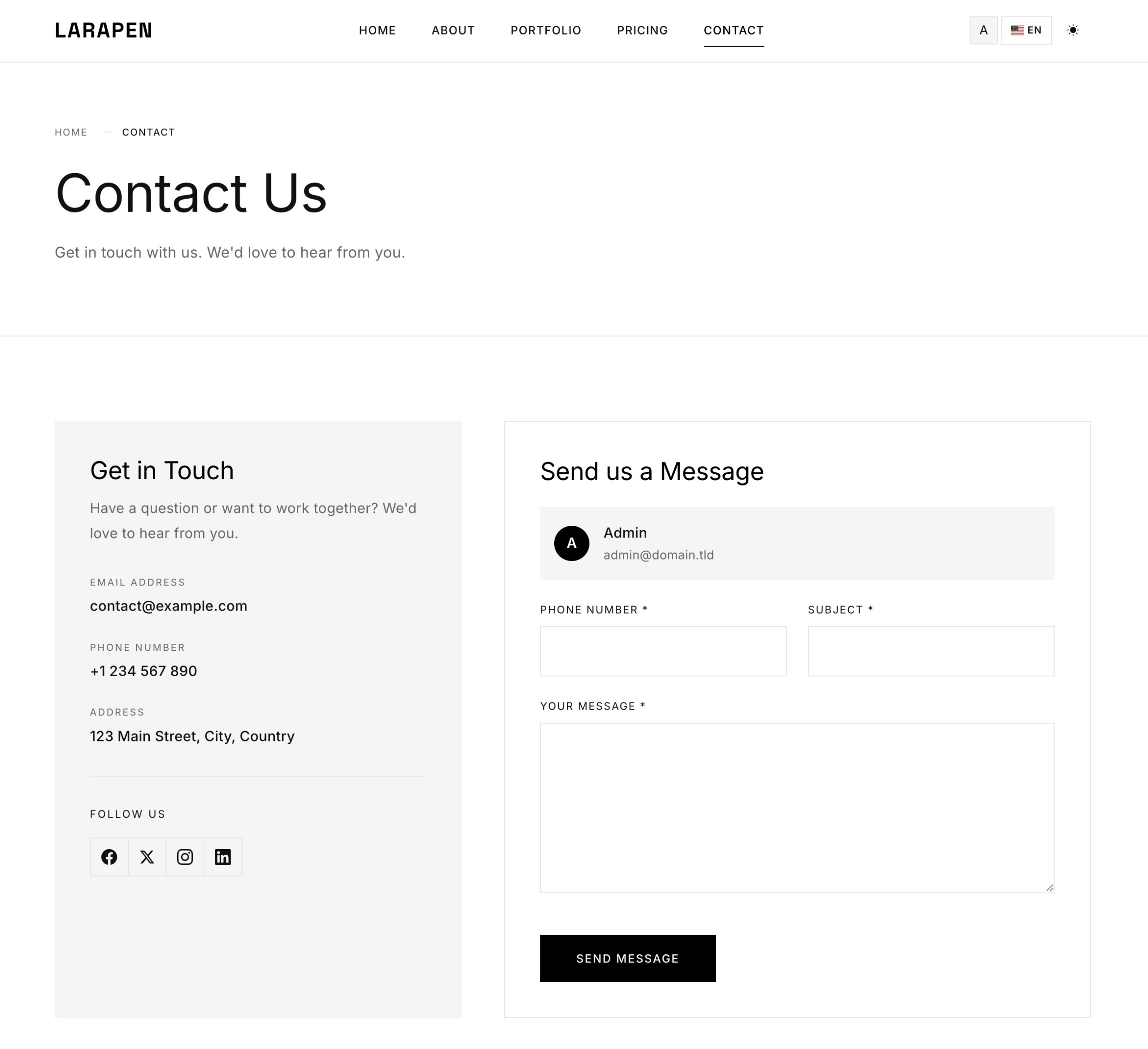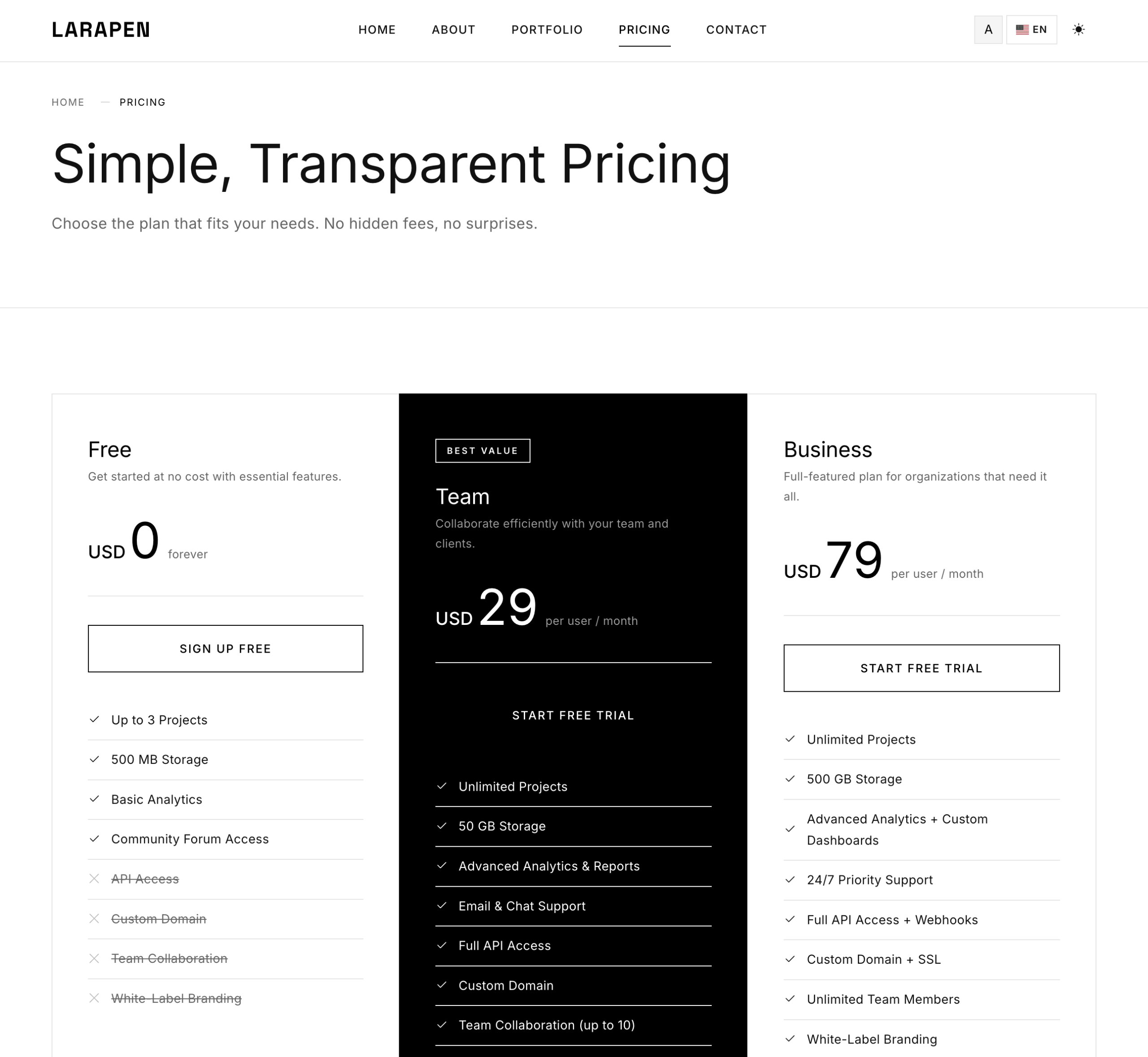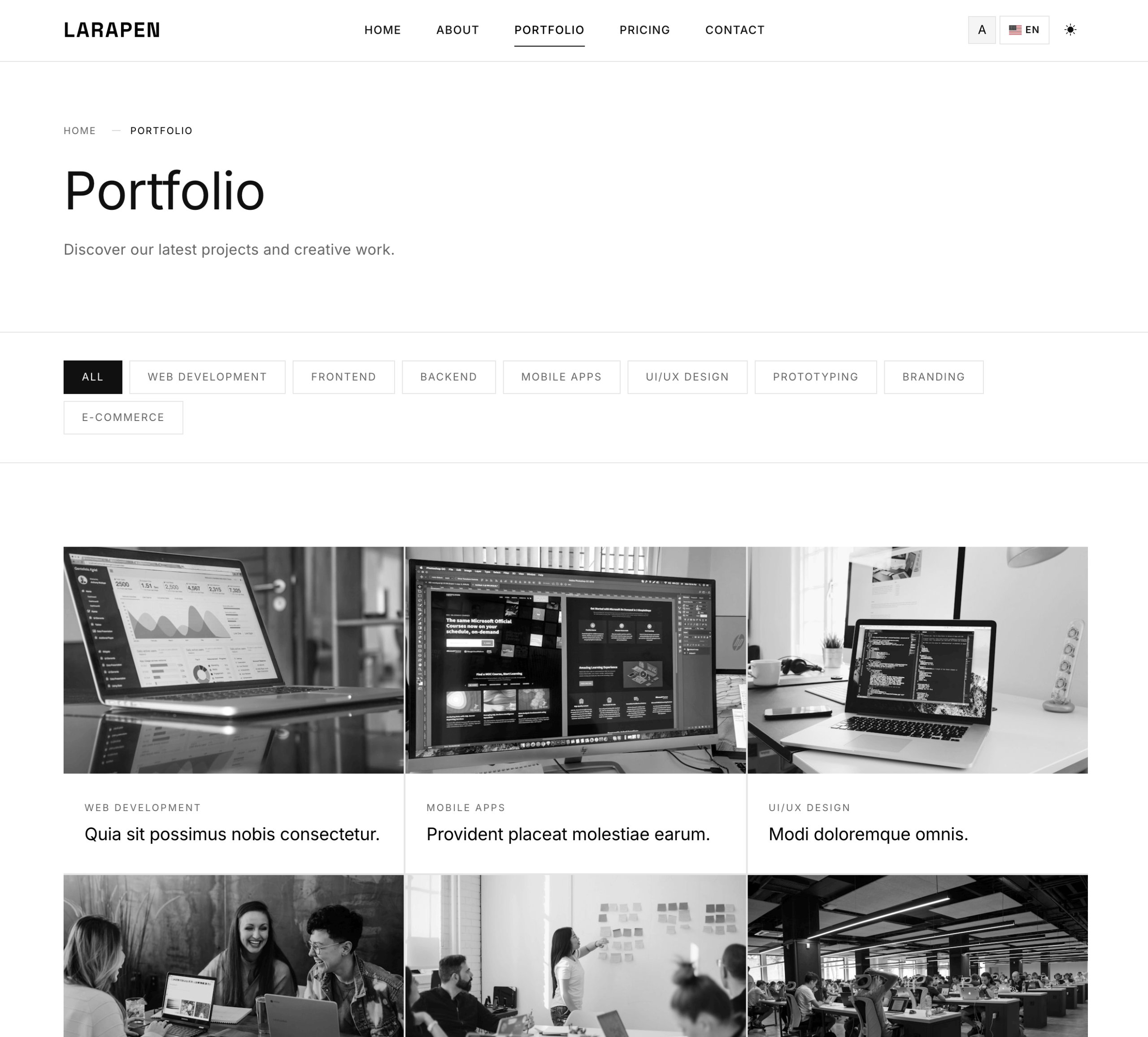 Every Larapen add-on: Blog, Shop, FAQ, Pricing, Team, Portfolio; has styled views that follow the Minimalist design philosophy. Clean, consistent, content-focused.