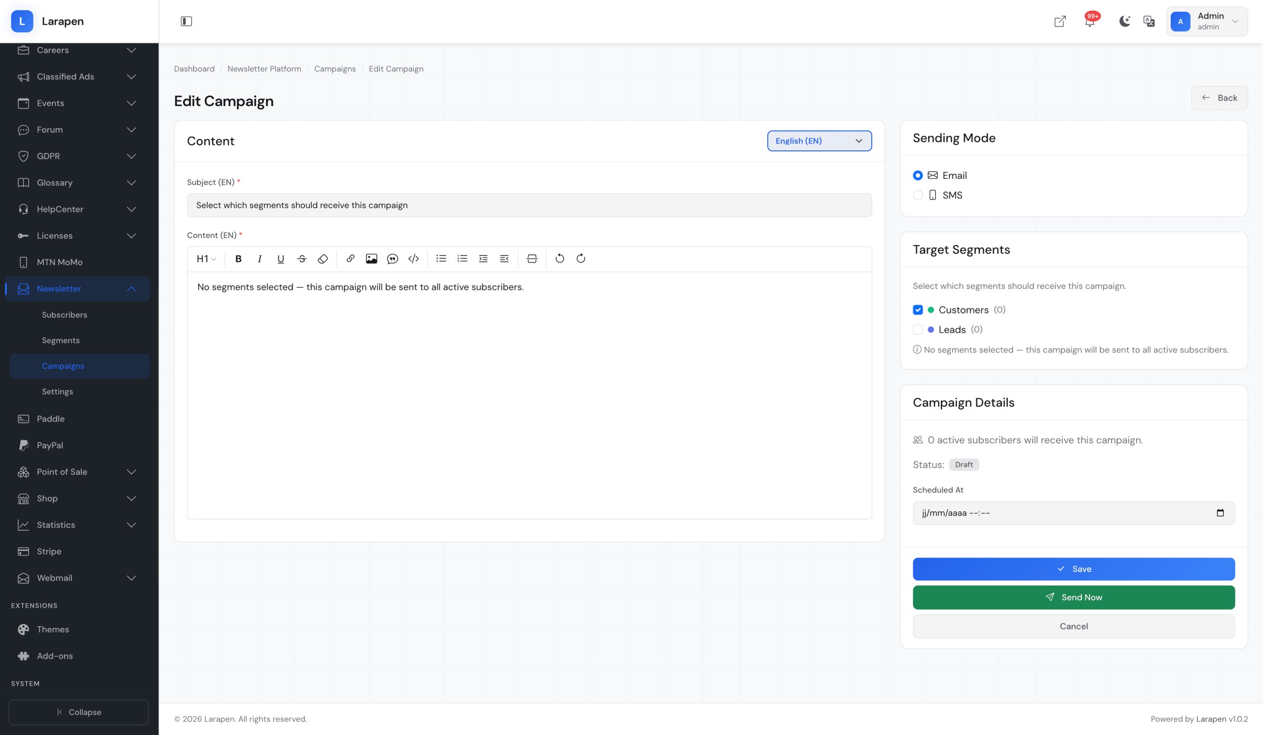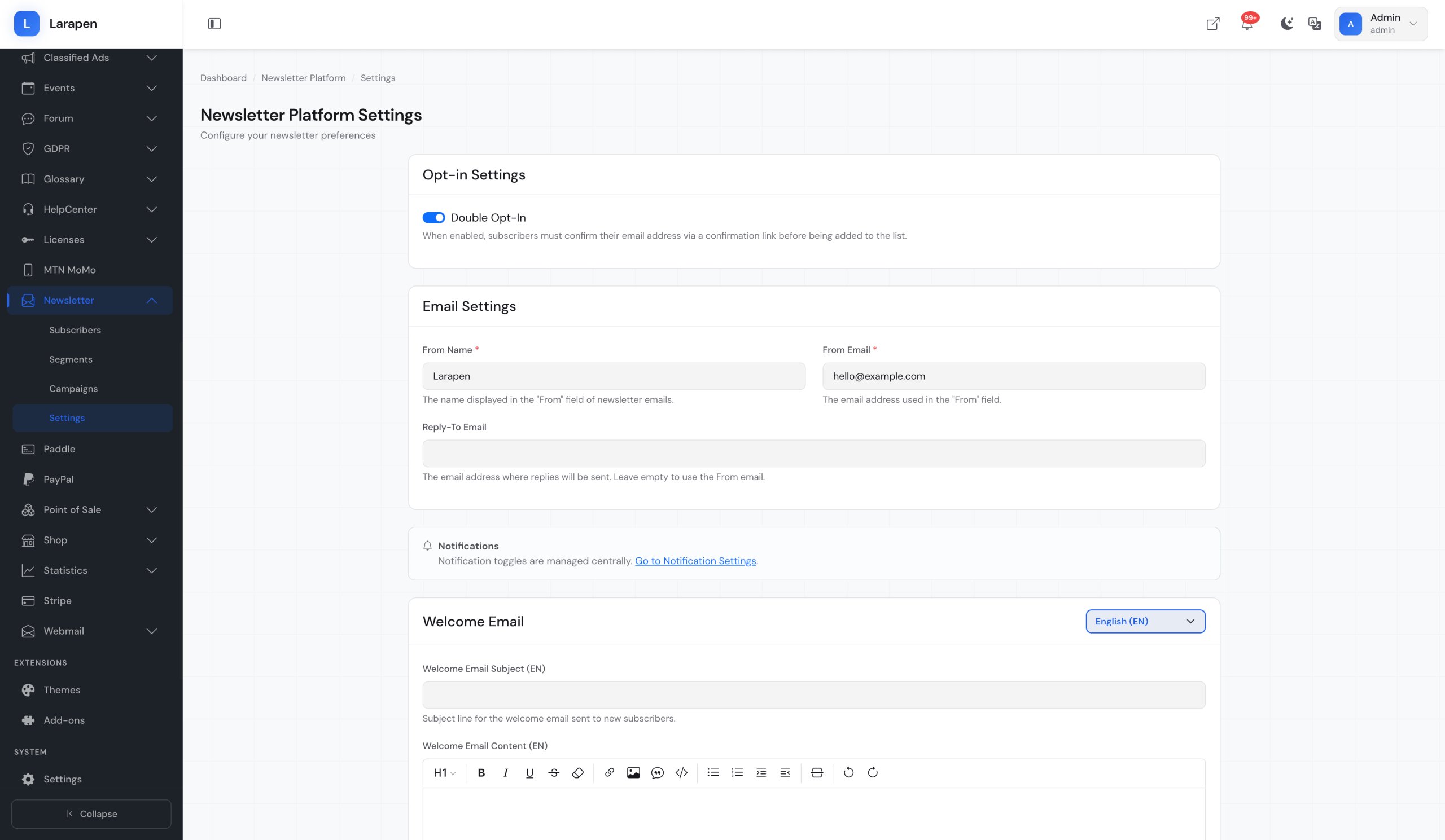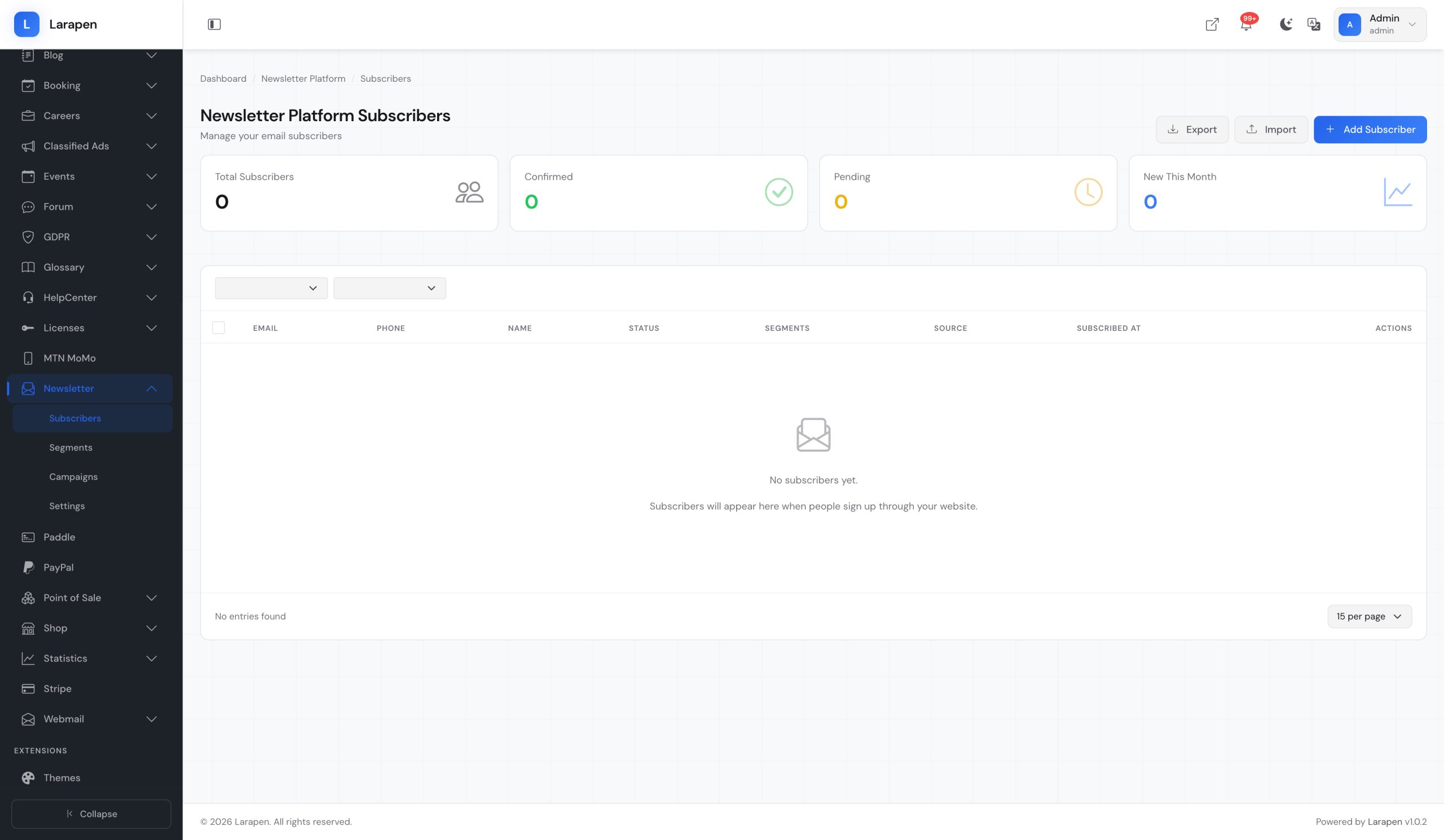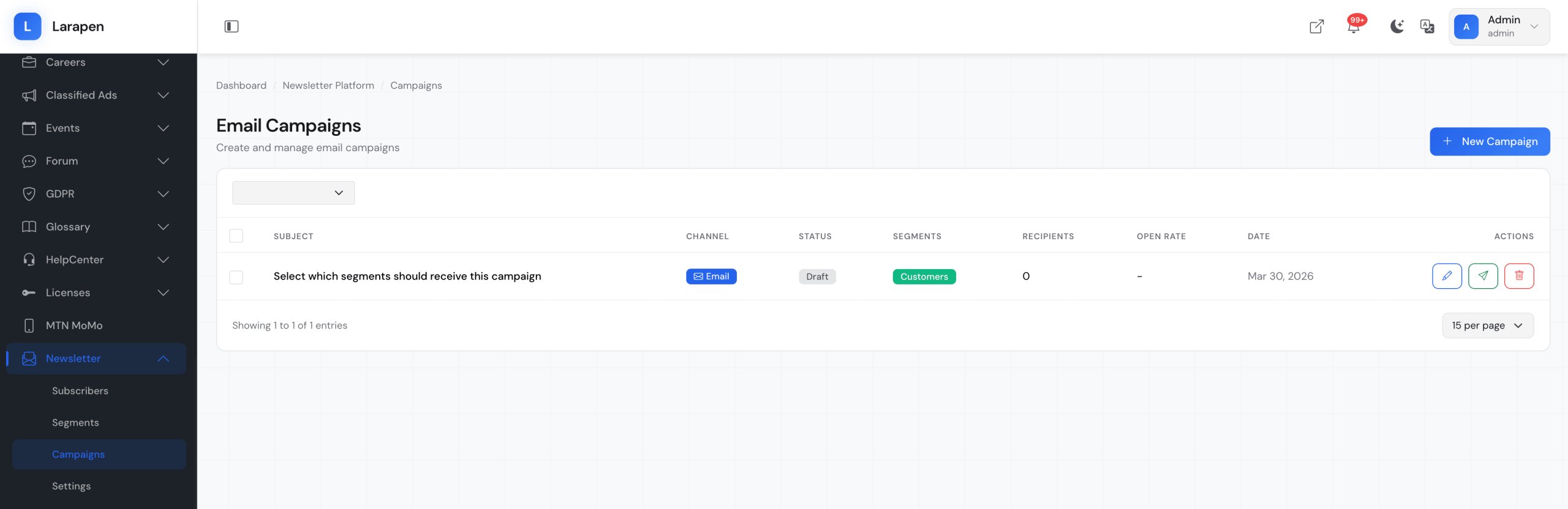 Build and nurture your email list with a built-in newsletter platform. Manage subscribers, create segments, design campaigns, and track performance; all without leaving your Larapen admin panel.