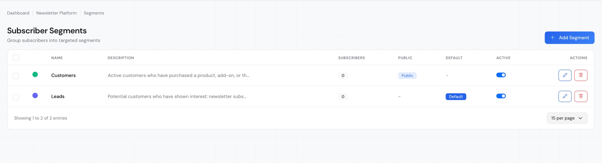Upload the Newsletter add-on and activate it. Subscriber and campaign tables are created automatically.