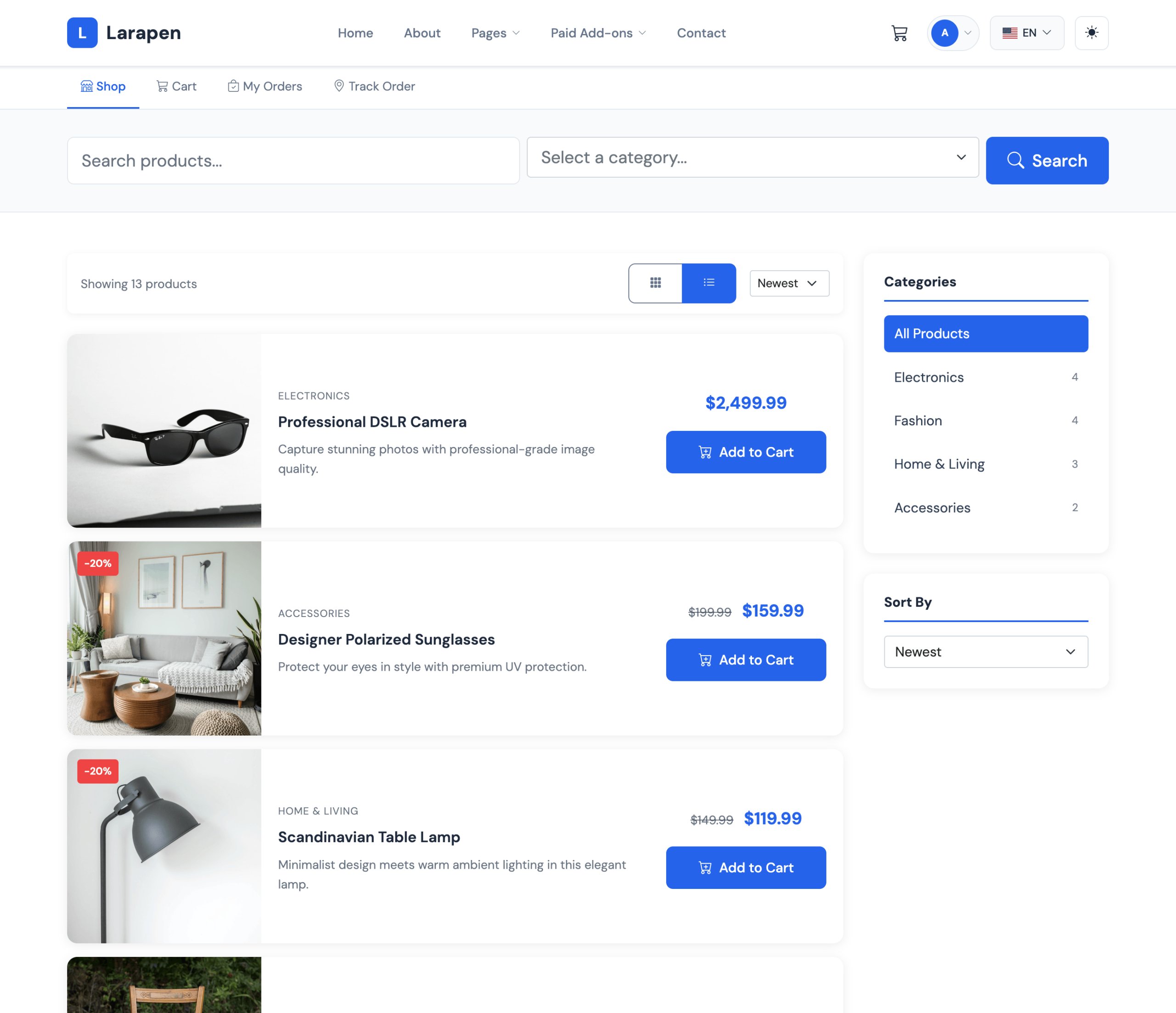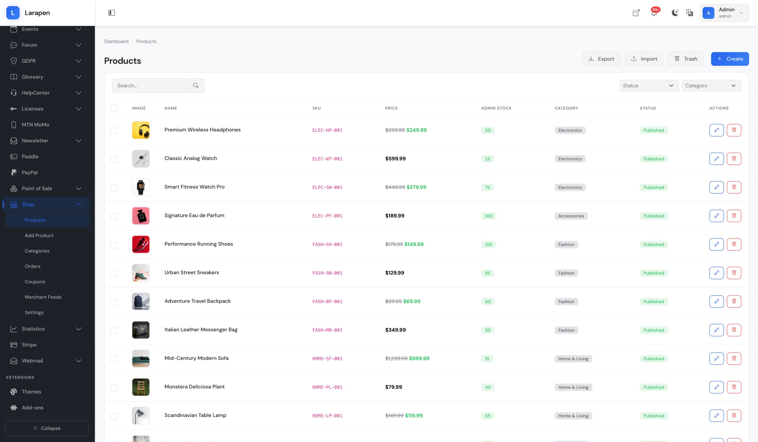 The E-Shop add-on transforms your Larapen website into a powerful online store. List physical products with variants (size, color, material) or sell digital goods with secure download links. Manage your entire catalog from a single, intuitive admin interface with bulk actions, stock tracking, and rich product descriptions.