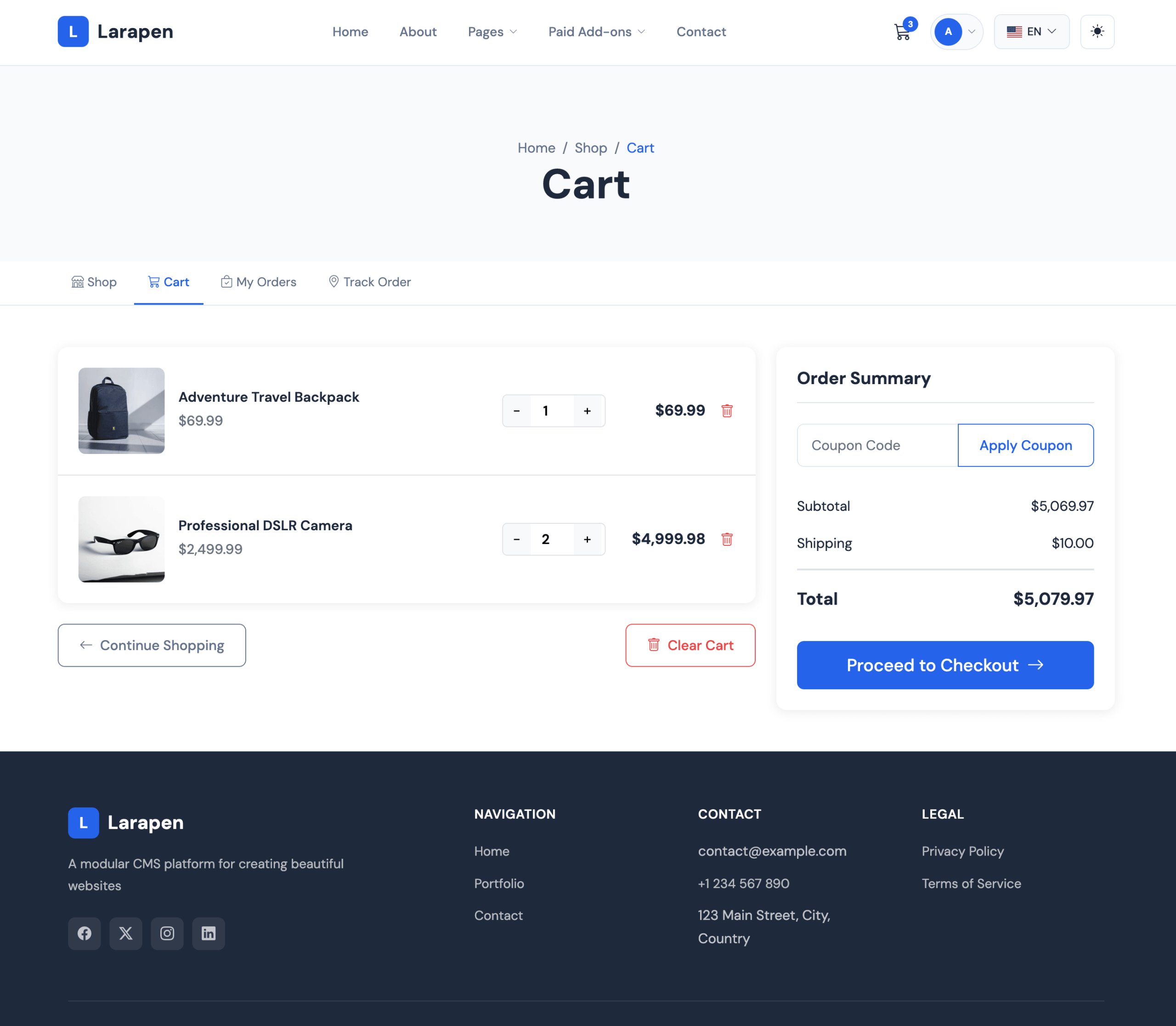 Give your customers a smooth buying experience with a streamlined cart and checkout flow. Integrate with payment gateways like Stripe and PayPal through dedicated add-ons, apply discount coupons, and track every order from placement to fulfillment; all within your Larapen dashboard.