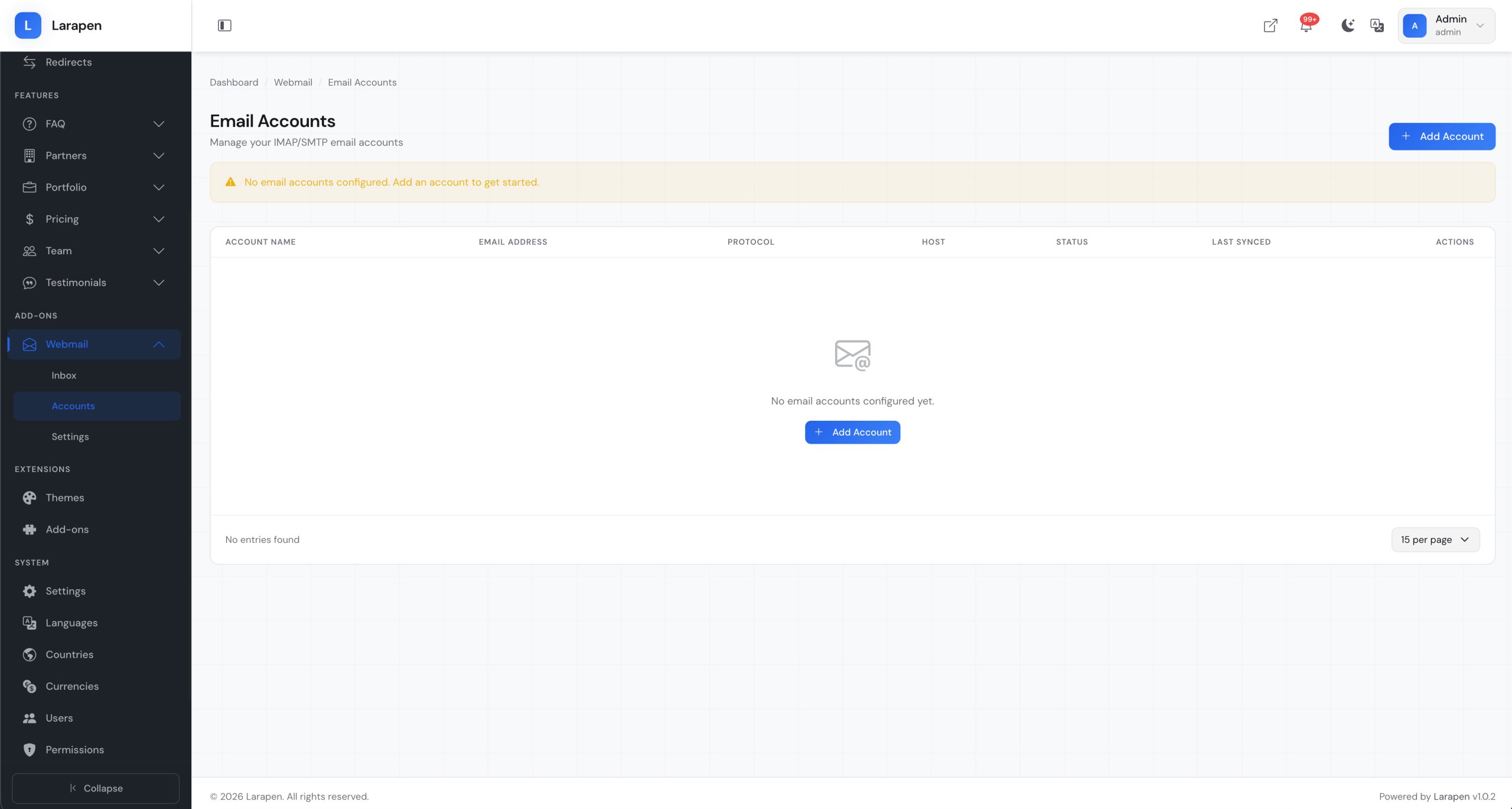 A built-in email client for your admin panel. Read, compose, reply, and manage emails from multiple accounts without leaving your Larapen dashboard.